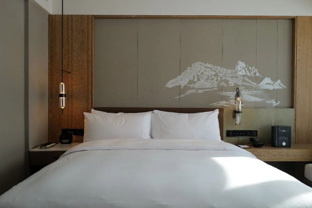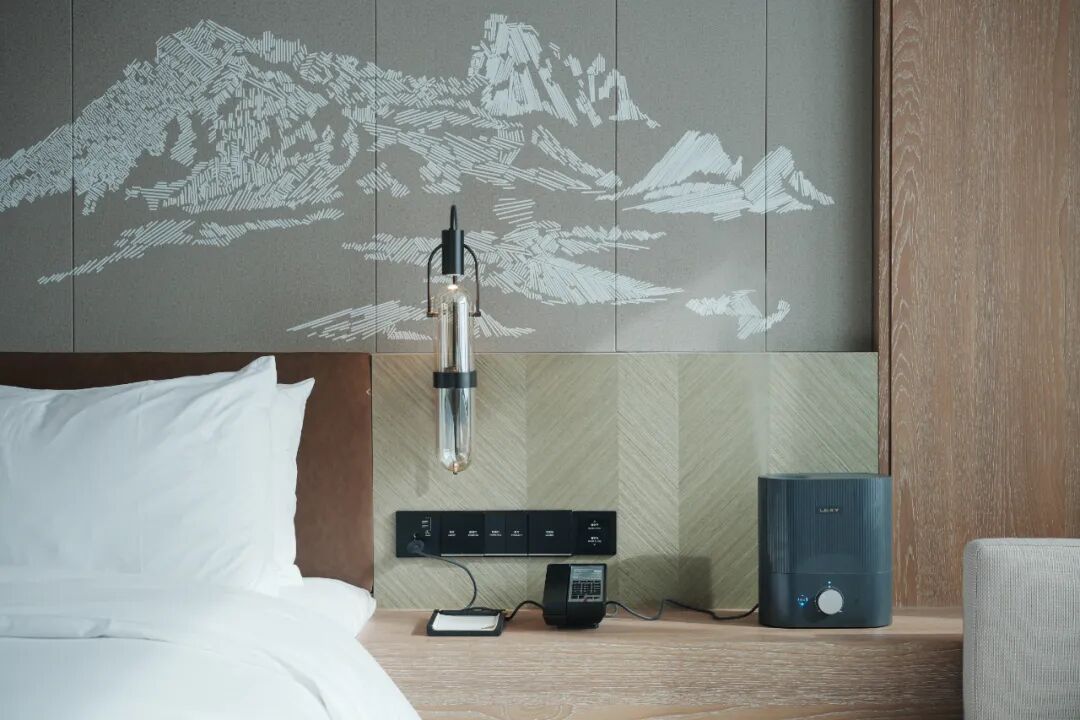 第二进是数十的睡眠区,床头贴心配备了音质出众的JBL蓝牙音箱和让室内湿度适宜的加湿器。床背板上用简练的线条,致敬环绕酒店的峻峭群山,机智且有力。