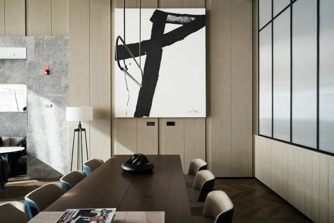 前台的背景墙,舒展着由清华美院的师生创作的抽象画,画布上用飘逸愉悦的笔法,勾勒出俊逸的群山和绵柔的白雪。以艺术的笔触致敬了周围风貌。