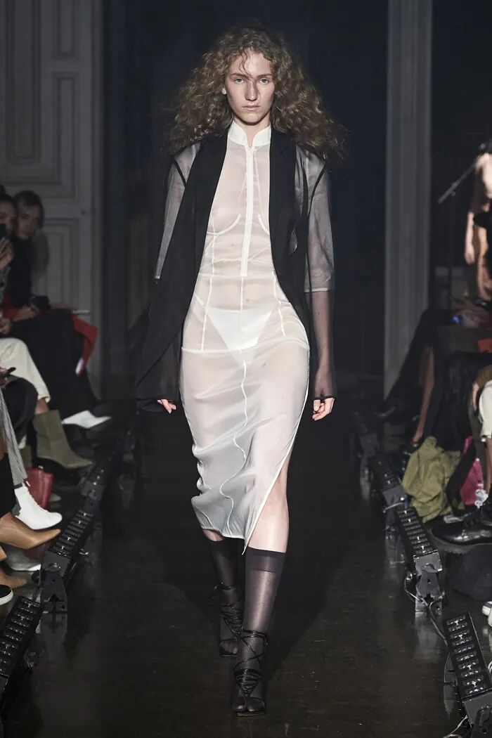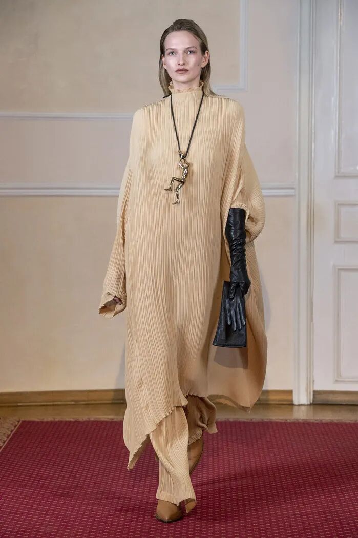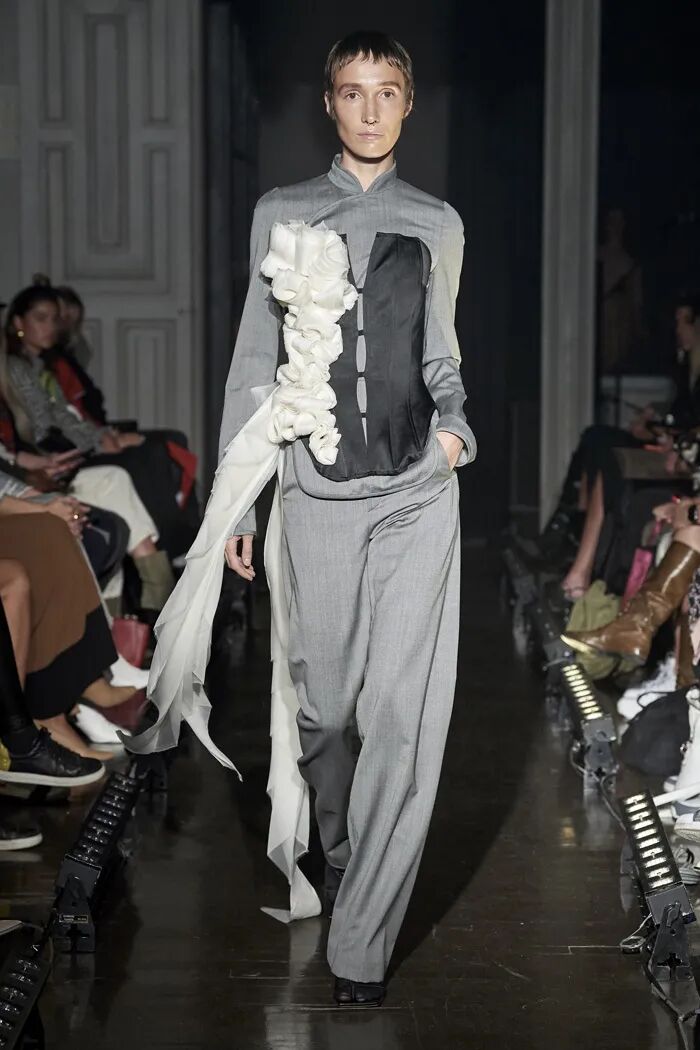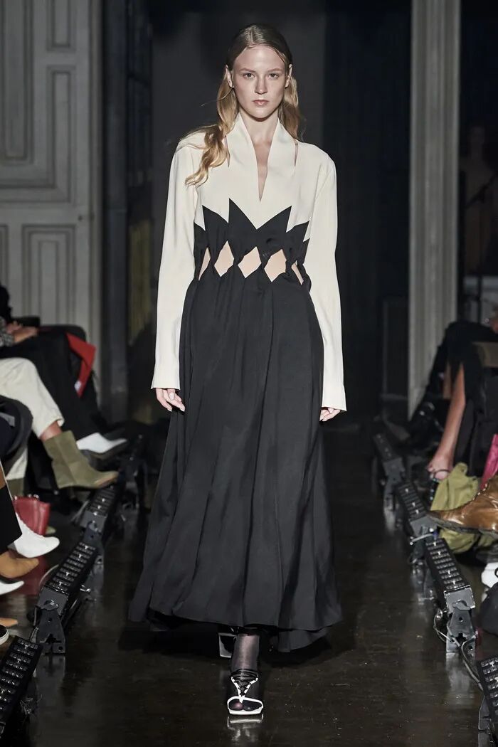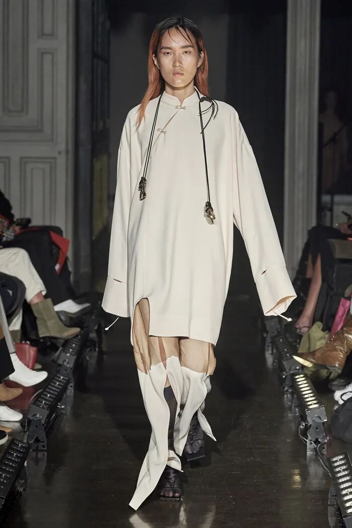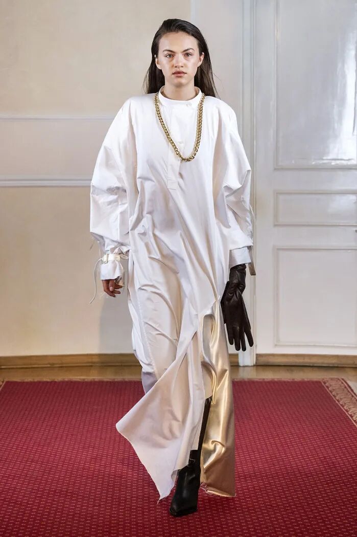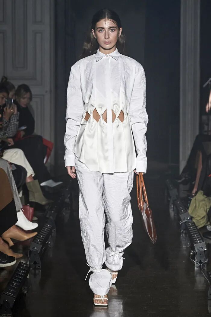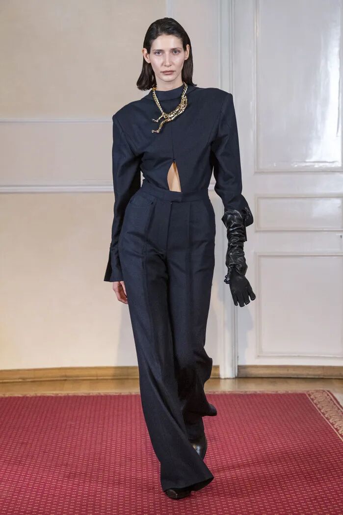 长款的白色衬衫与阔腿及脚面的裤子在Lilia Litkovskaya的设计之下,变幻出了绑带的结构和若隐若现的分割。精致的套装搭配着黑色的皮质手套和腰部的镂空,让整体更加的亮眼。