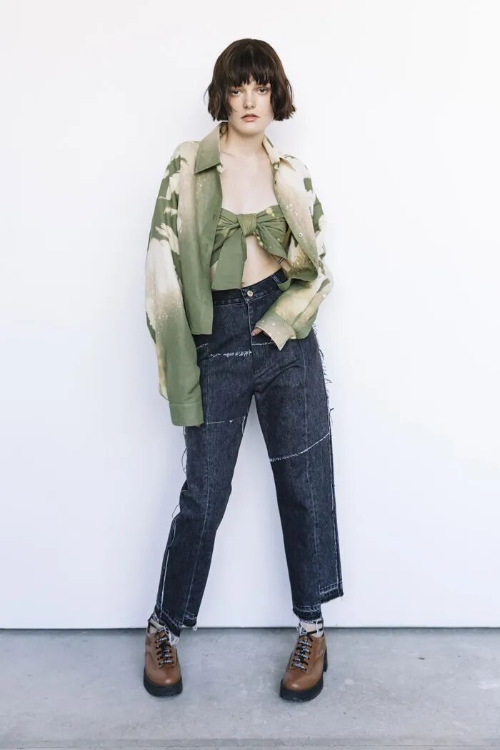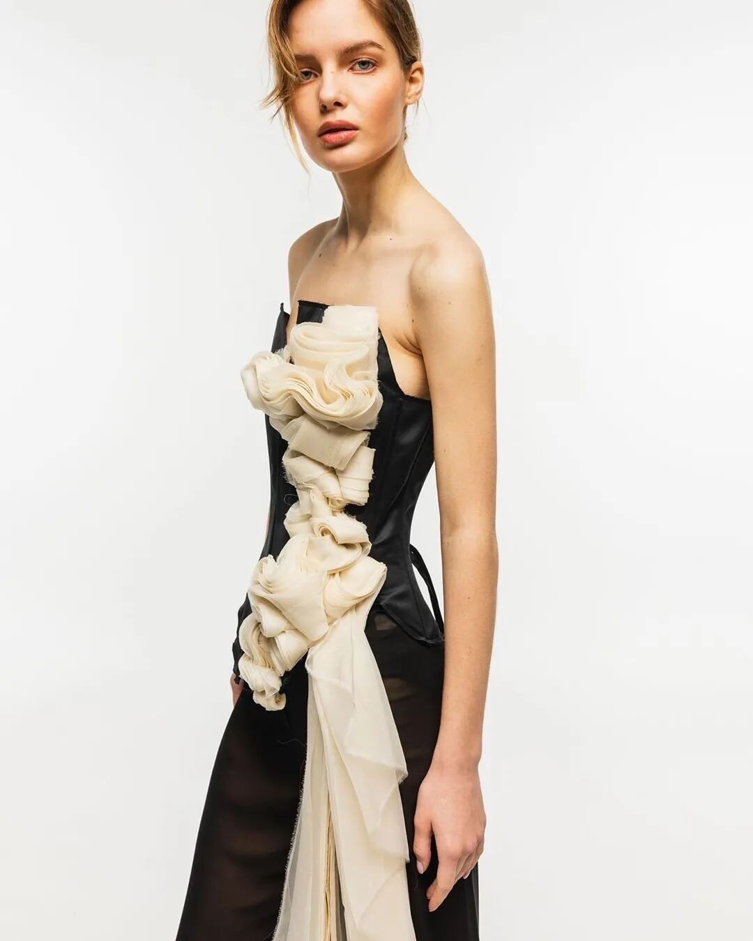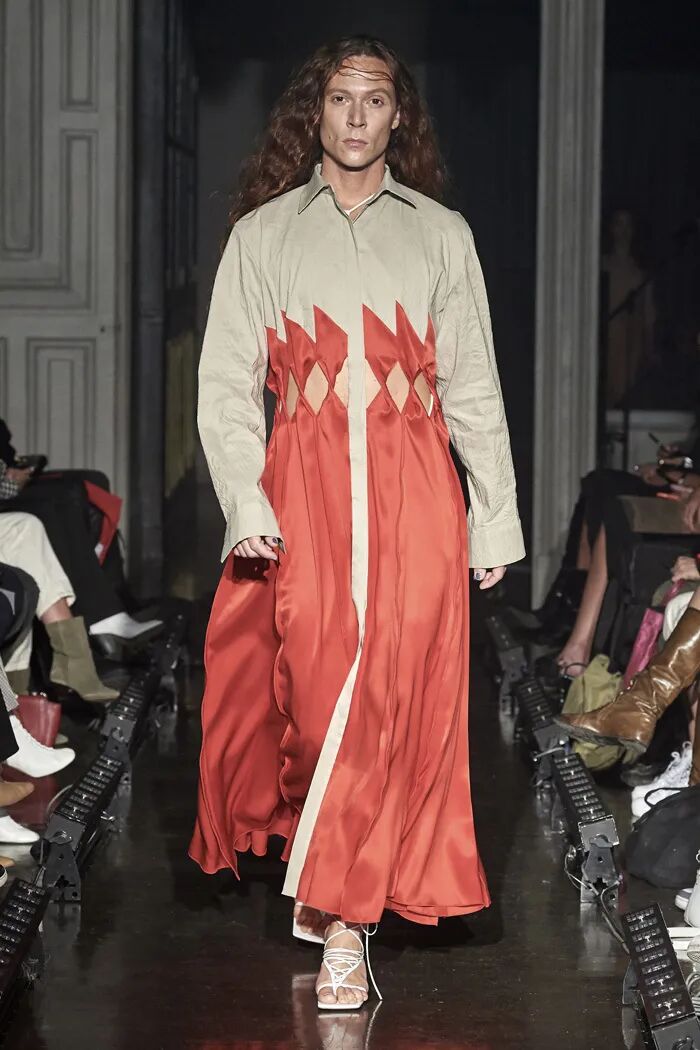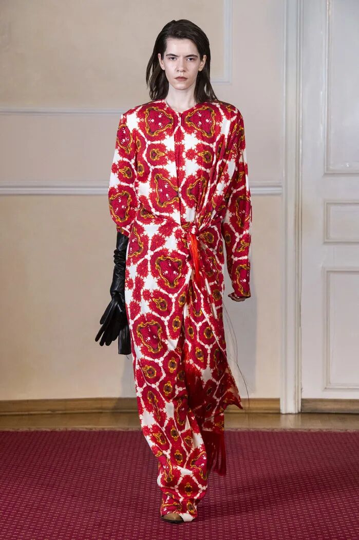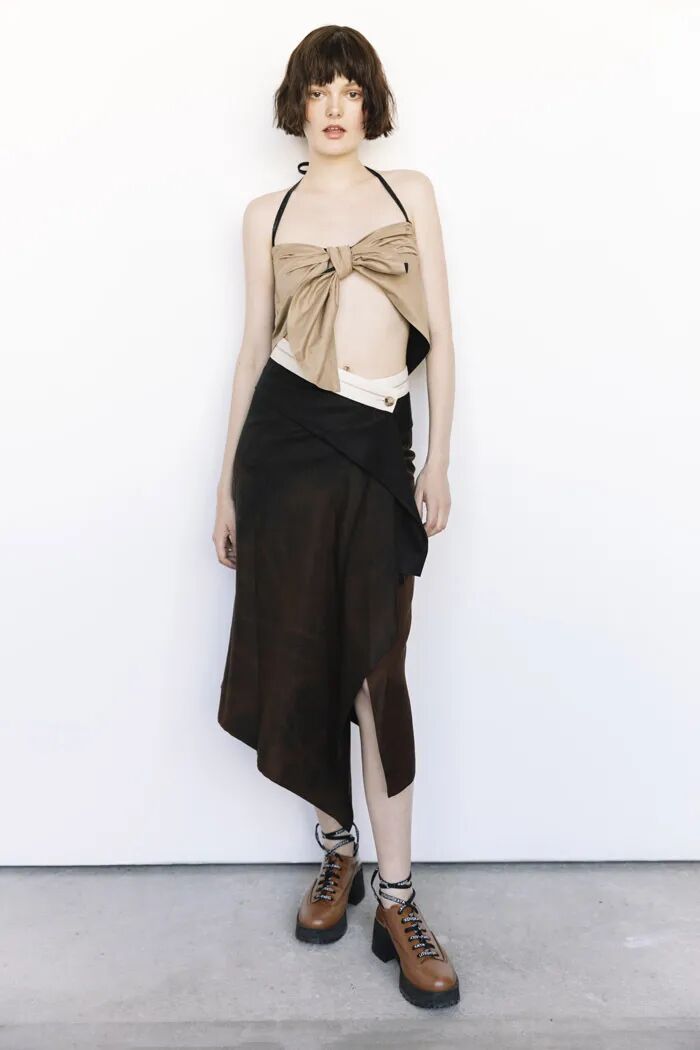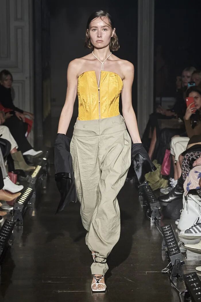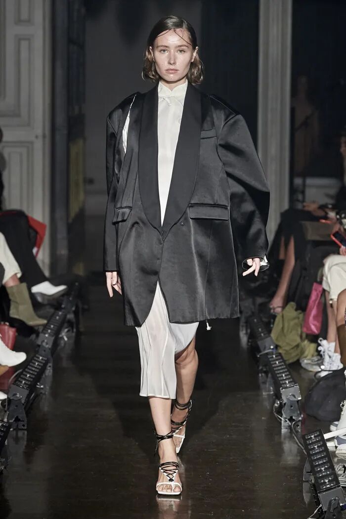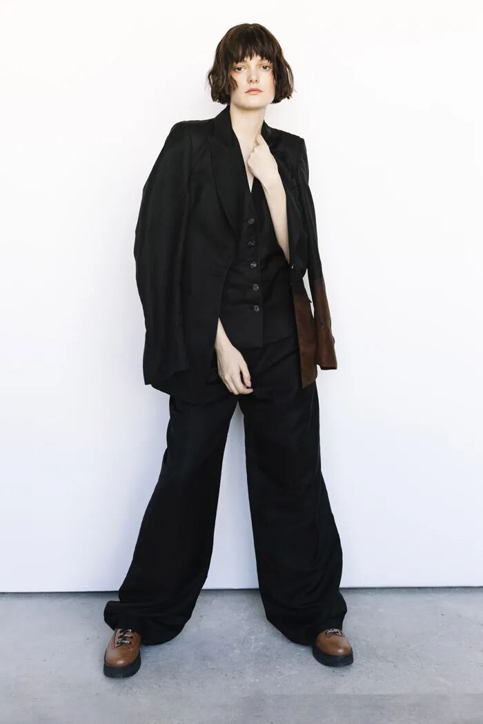 长款的白色衬衫与阔腿及脚面的裤子在Lilia Litkovskaya的设计之下,变幻出了绑带的结构和若隐若现的分割。精致的套装搭配着黑色的皮质手套和腰部的镂空,让整体更加的亮眼。