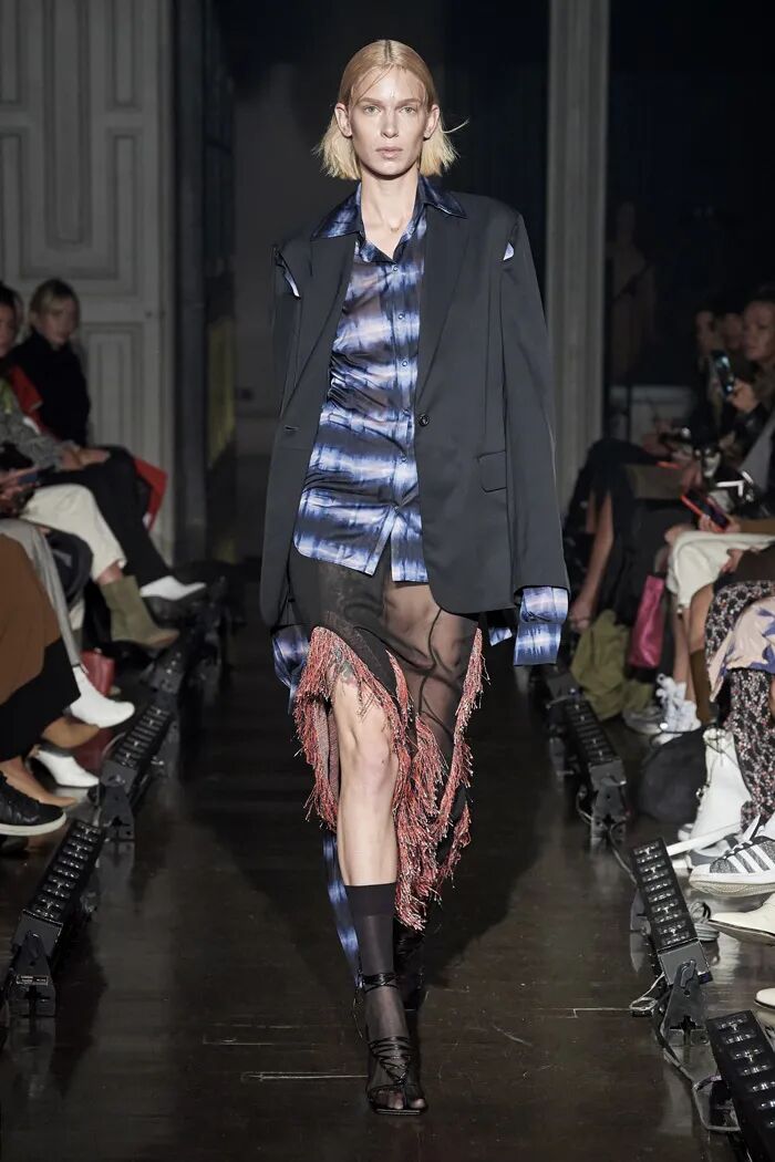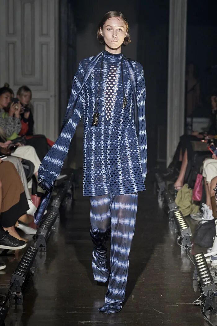 Lilia Litkovskaya还将扎染应用在面料设计中,深浅相间的蓝色自然过渡在面料上给人一种飘飘欲仙的既视感,与摆动的绑带呼应着。