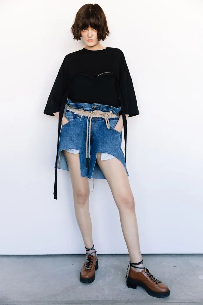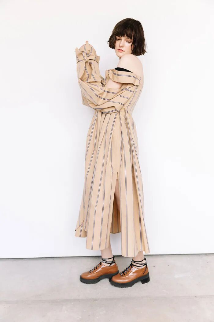 Lilia Litkovskaya的设计魅力之处就在于,她让日常中普通的单品变得不平凡。蓝色的条纹衬衫和包臀裙经过袖子处的变形与裙筒处的分割,为整体的Look增添亮点。