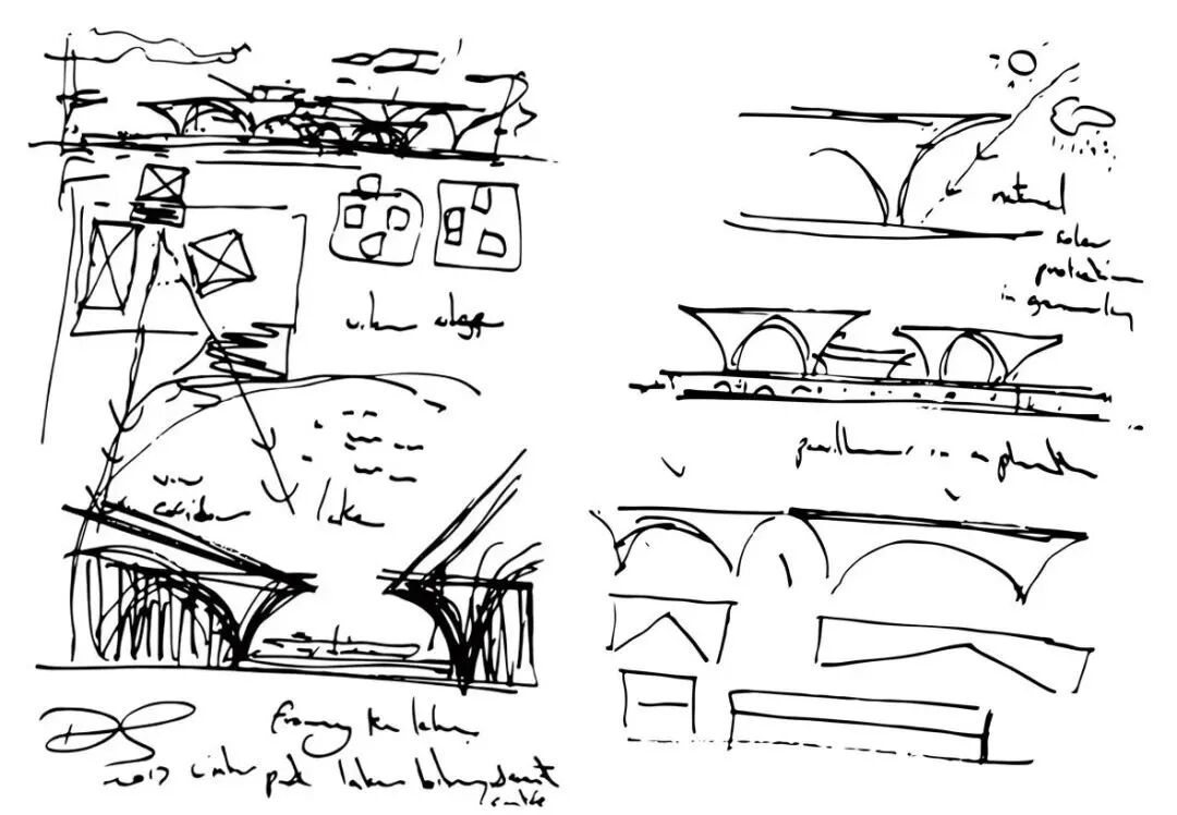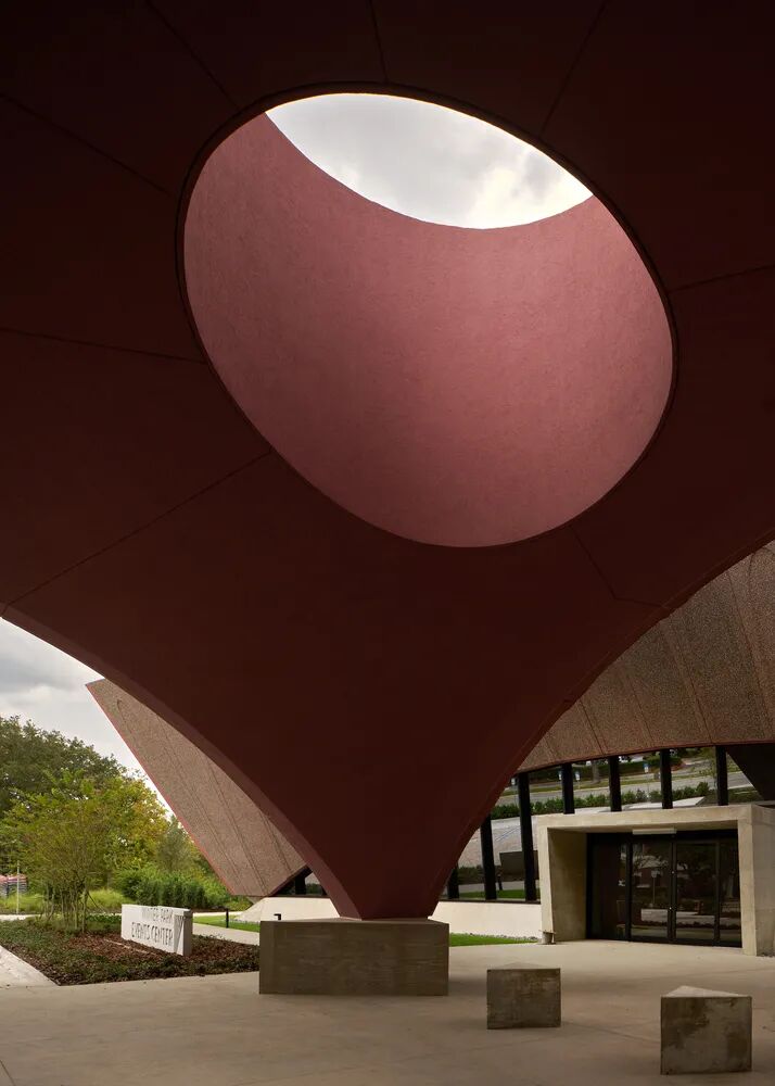 建筑以亲生物设计为原则、与当地独特热带气候生态相协调,由玫瑰色调混凝土浇筑而成,共同伫立在一个凸起的观景台上,为建筑内部的人们展示了门德森湖(Lake Mendsen)如田园诗歌般平和的风景。