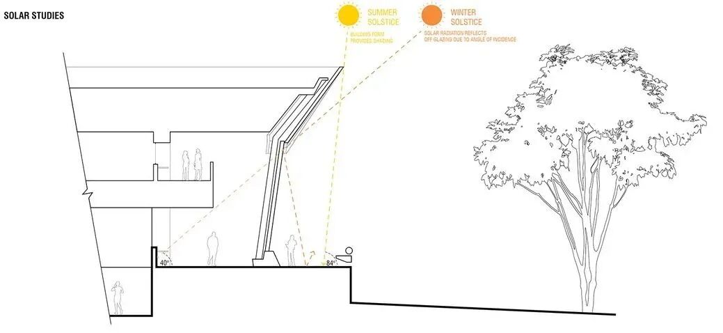 三个建筑结构的方向基于太阳路径,使活动中心能够为图书馆提供遮荫以进行上午的活动,而图书馆则为活动中心提供遮荫以进行下午晚些时候的活动。