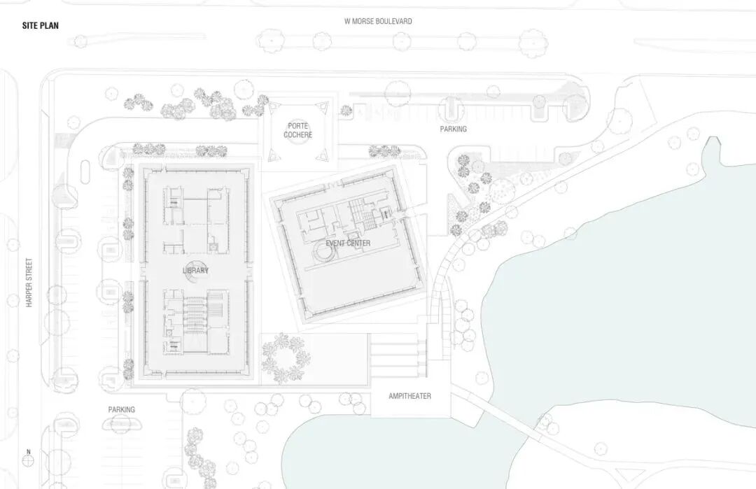温特帕克图书馆由三栋建筑单体构成,形成“微型村落“。 “村落”由一个新筑的双层图书馆,一个带有屋顶露台的活动中心和一个迎宾门廊组成。