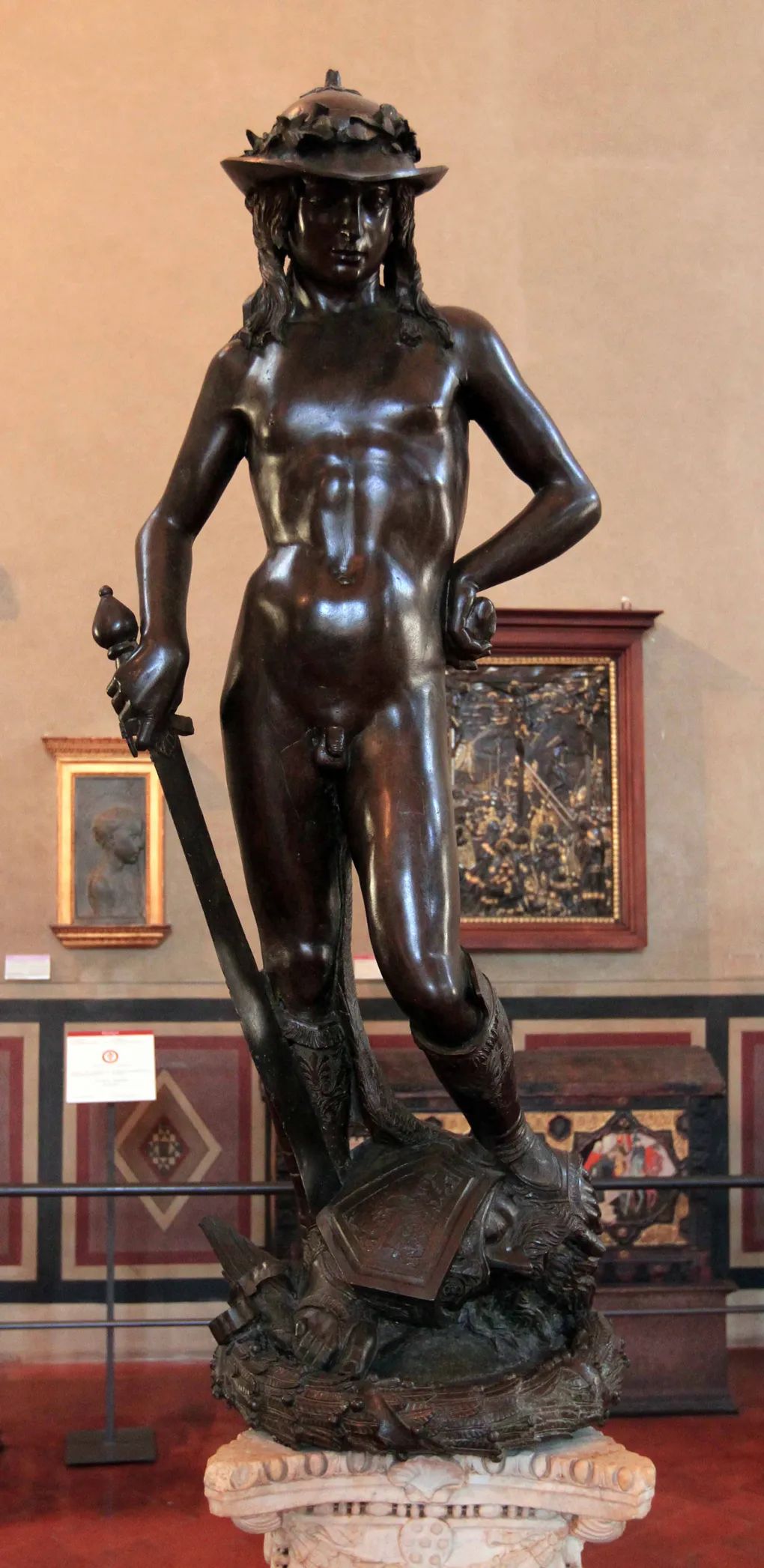 大家好!今天给大家介绍由意大利文艺复兴初期的雕塑大师多纳泰罗于1460年间创作的青铜雕像《大卫》,现收藏于意大利佛罗伦萨巴杰罗国家博物馆。