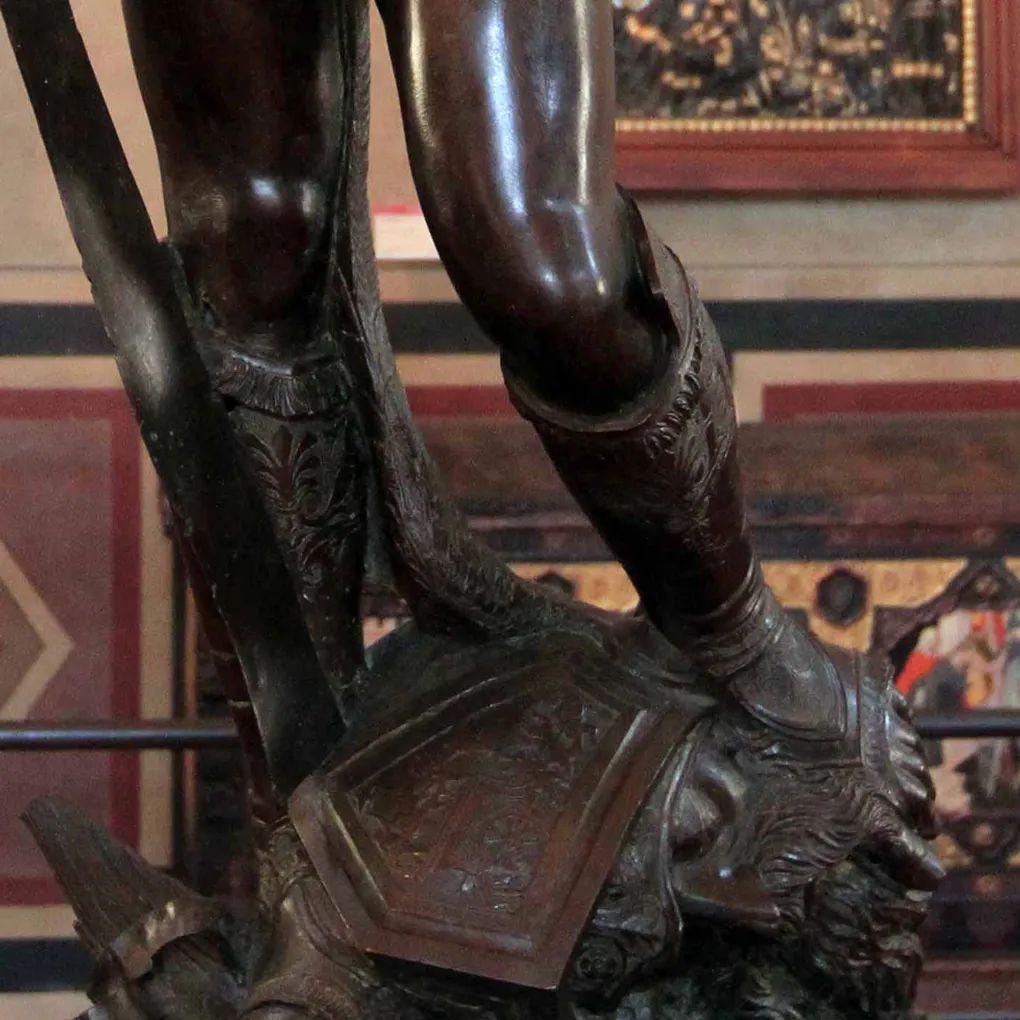 意大利艺术史家乔治•瓦萨里在描述这件作品时写道:“他的一只脚踩着被砍下的歌利亚的头颅,右手拿着一柄利剑,真切自然,细腻柔和,就像活人一样。”