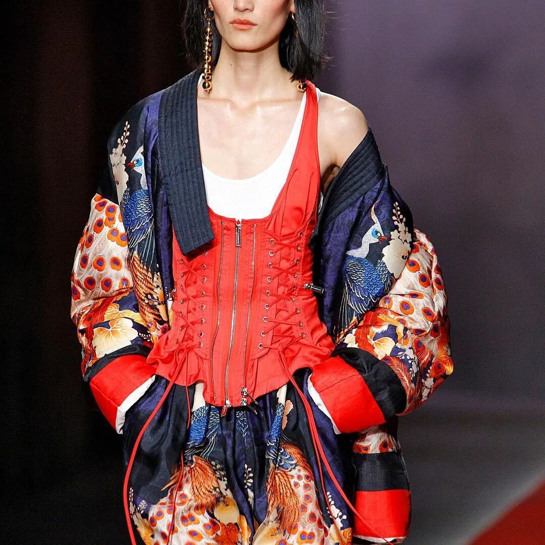 值得一提的是,品牌一开始只有男装,2002年被麦当娜邀请做造型设计,2003年,在波音喷气式飞机的轰鸣下,Dsquared2正式发布首个女装系列“明星24/7 (Star 24/7)”。20年过去,Dsquared2发布此系列庆祝,将他们的混搭风格提升到新的高度。