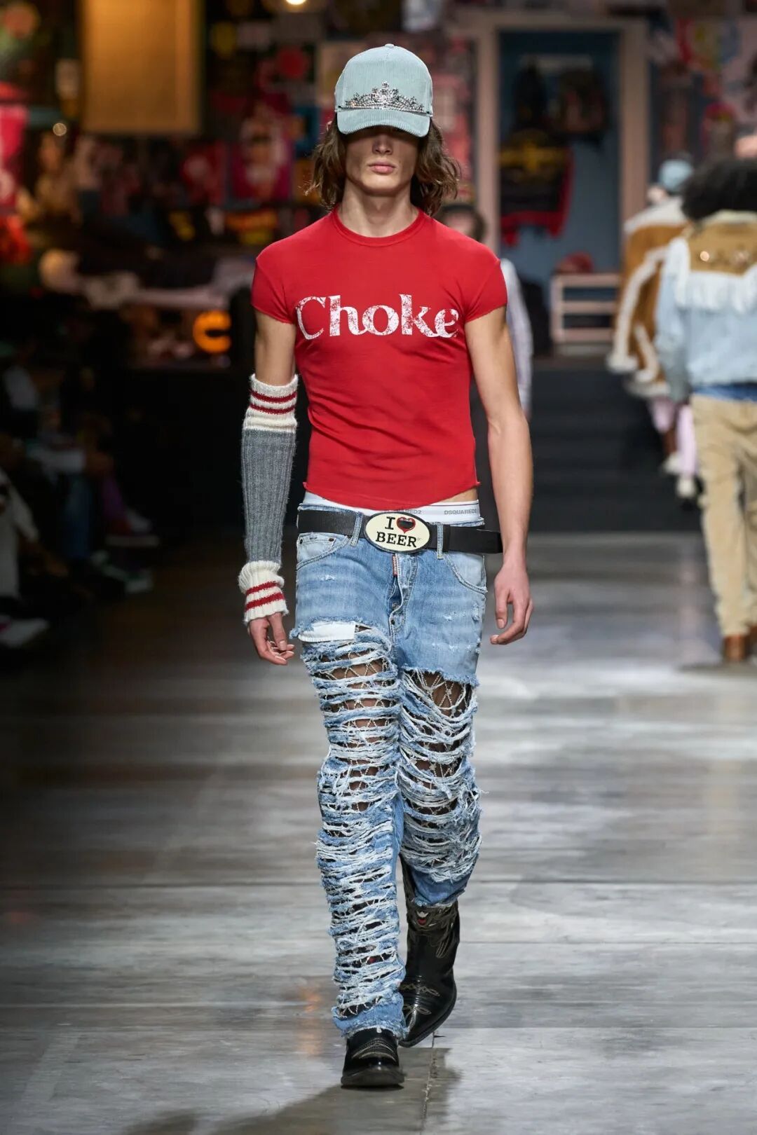 Dsquared 的一群青少年炫耀着来自 Catens 宿舍时代的一串字符:极客、哥特、明星、emo、女性,都穿着他们自己破碎/重新组合的服饰。