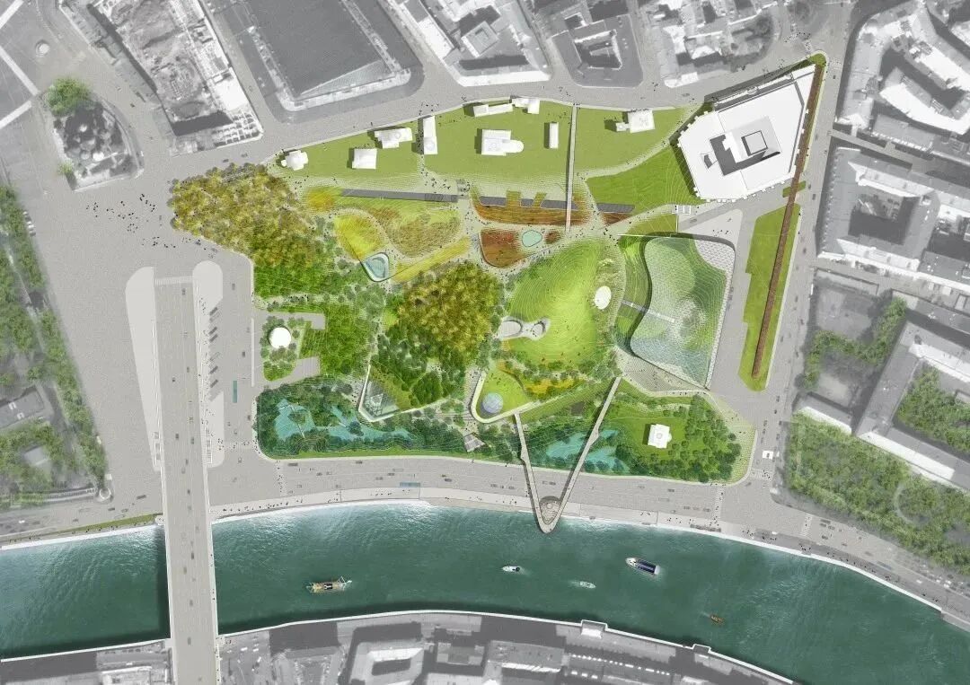 扎里亚季耶公园是五十年来在莫斯科建造的第一个大型公园,景观和硬景观交织在一起,创造出一种“狂野的都市主义”,引入了一种新的产品来赞美莫斯科历史上正式的、对称的公园空间。定制的石材铺路系统将硬景观和景观编织在一起,产生一种融合效果,打消了边界,让游客在其中自由漫步。