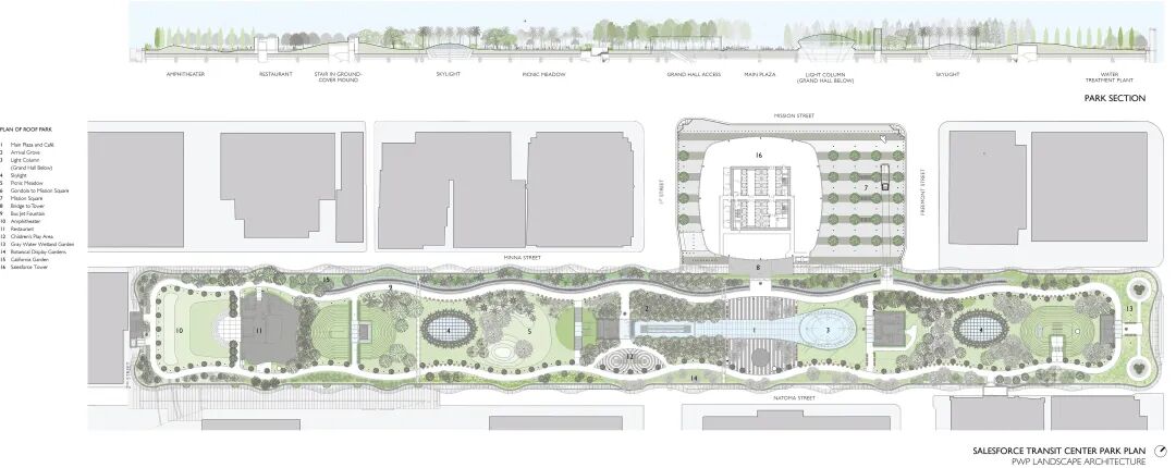 公园位于旧金山市中心,想要成为真正的枢纽和多式联运交通中心,设计连接了11个交通系统,并将城市与地区、州和国家连接起来。项目包括一个占地2.2公顷的屋顶公园,在其周围新的混合用途社区的发展过程中,已成为中央公共开放空间。