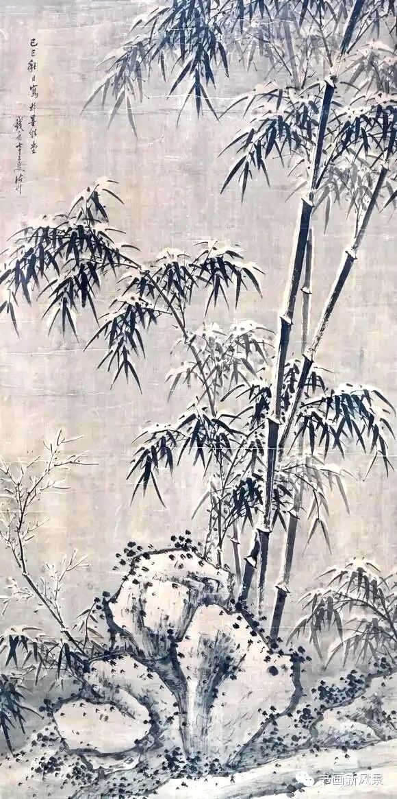 上图写雪竹,笔法与众不同,竹以双钩疾笔写出,点笔写出灌木,雪是用枯笔随意点垛,洋洋洒洒,笔法老辣,更见生趣。在历代雪竹作品中,独树一帜。