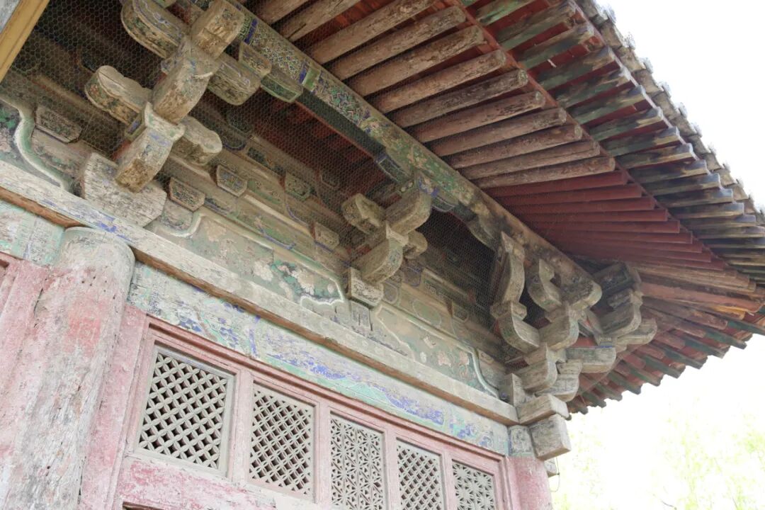 大殿上的斗拱为柱头一朵,补间一朵,出两跳五铺座,采用“偷心造”,转角斗拱在出两跳的角华拱上再加抹角拱,用材粗大,结构严谨,出檐深远。