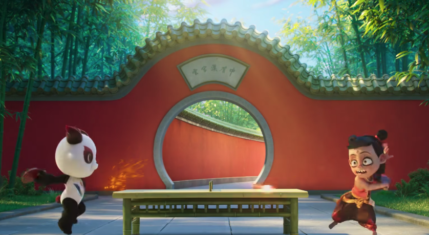画面一转,蓉宝和哪吒在武侯祠博物馆比试乒乓球,
