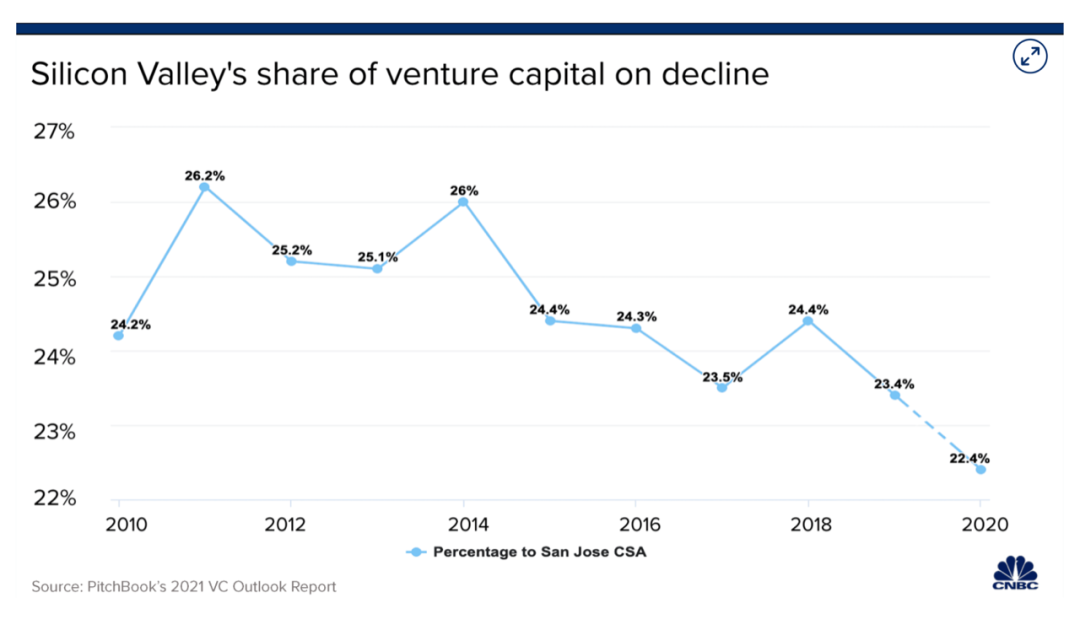 近年来,随着其他创新热点的兴起,硅谷的风险投资额占比有所下降,但是,仍然在20%到四分之一之间。