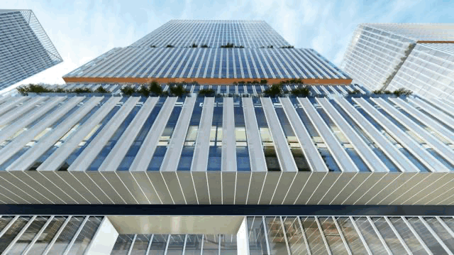 地上二层设置风雨无阻的阳光环廊,贯穿整个项目。这条廊道以较大的尺度构筑了一条极具魅力的漫步道,同时连接二层平台延伸出的节点广场和塔楼入口。7*24小时的创智生活,在阳光环廊中得以实现。