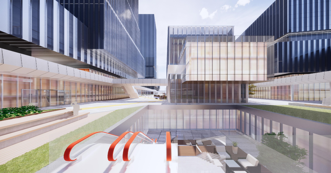 打造活力产业社区的重点在于人与人之间的互动串联,结合现代服务产业园内“人车分流”的需求,一条贯穿整个项目的公共连廊步行系统应运而生。