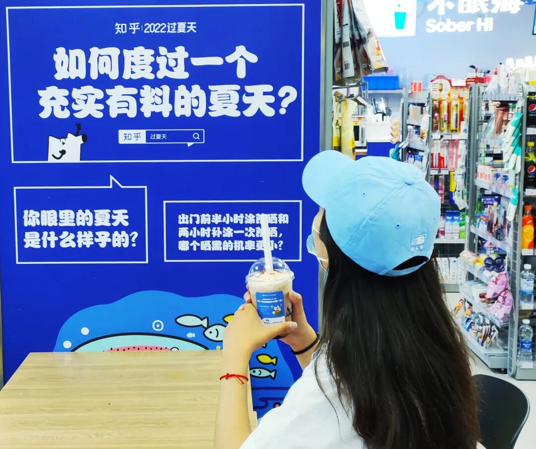 在执行上,知乎携手便利蜂在北京打造“知乎有料夏日便利店”,联合不眠海围绕“知乎超有料 不眠嗨一夏”的主题打造联名饮品,将站内“有料”的夏日讨论内容及创作者,通过线下场景进行外放露出,让大家在线下打卡的过程中,以真实的视角发现知乎夏天有趣有料的内容,对品牌的认知自然也再深一层。