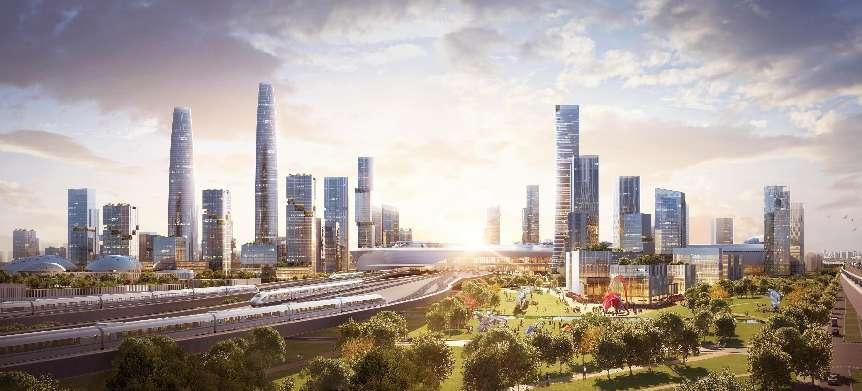 枢纽站房、活力绿轴、地标建筑簇群相互融合,成为开放共享的“城市客厅”、汇聚人流的“站城门户”。