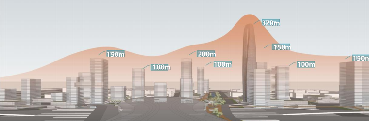 地标塔楼布置在绿轴东侧,靠近骨干轴线,围绕地标塔楼,形成具有显示度和标志性建筑簇群。建筑界面、平台空间与枢纽站房形体呼应。