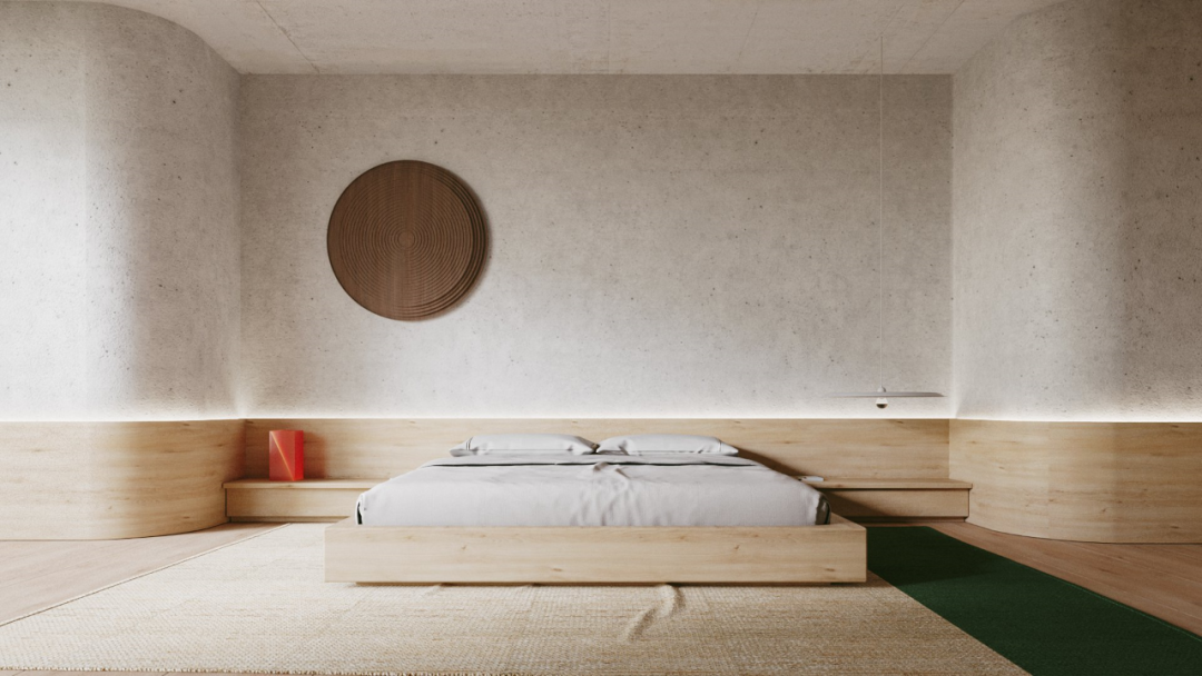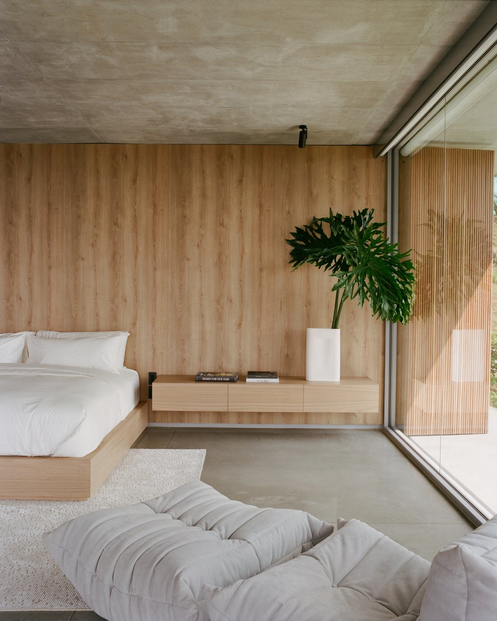 二楼作为休息区,每间卧室内都选用了混凝土结合木饰面墙的设计,这一软一硬的两种材料碰撞形成了一种独特氛围效果。