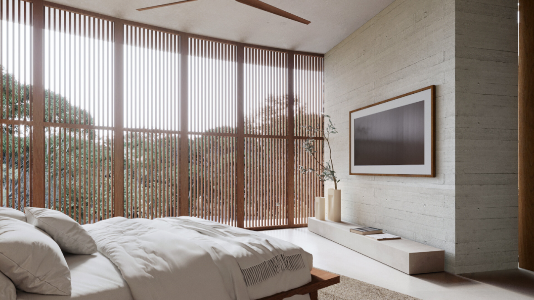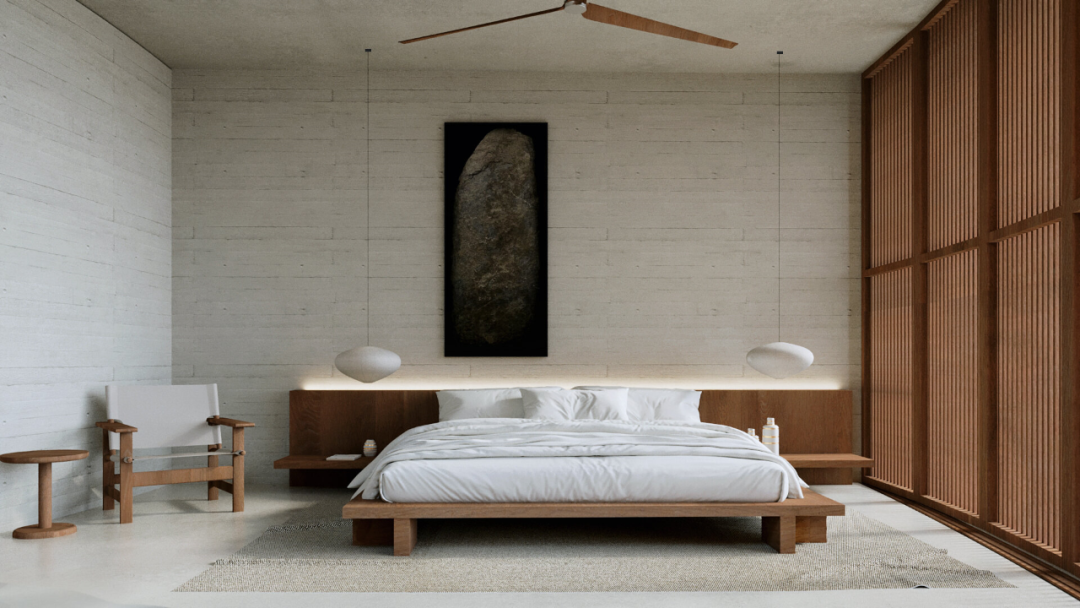 卧室的设计带有一丝朴实温暖的禅意风格,在柔和的灯光与格栅窗户的渲染下,创造了平静舒适睡眠空间。