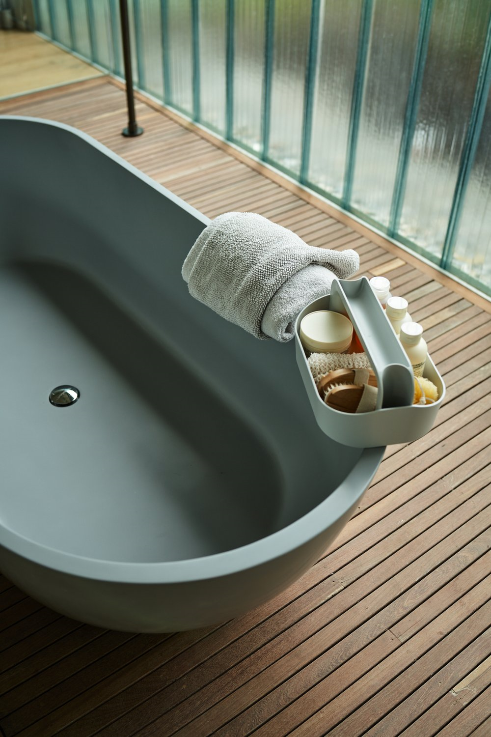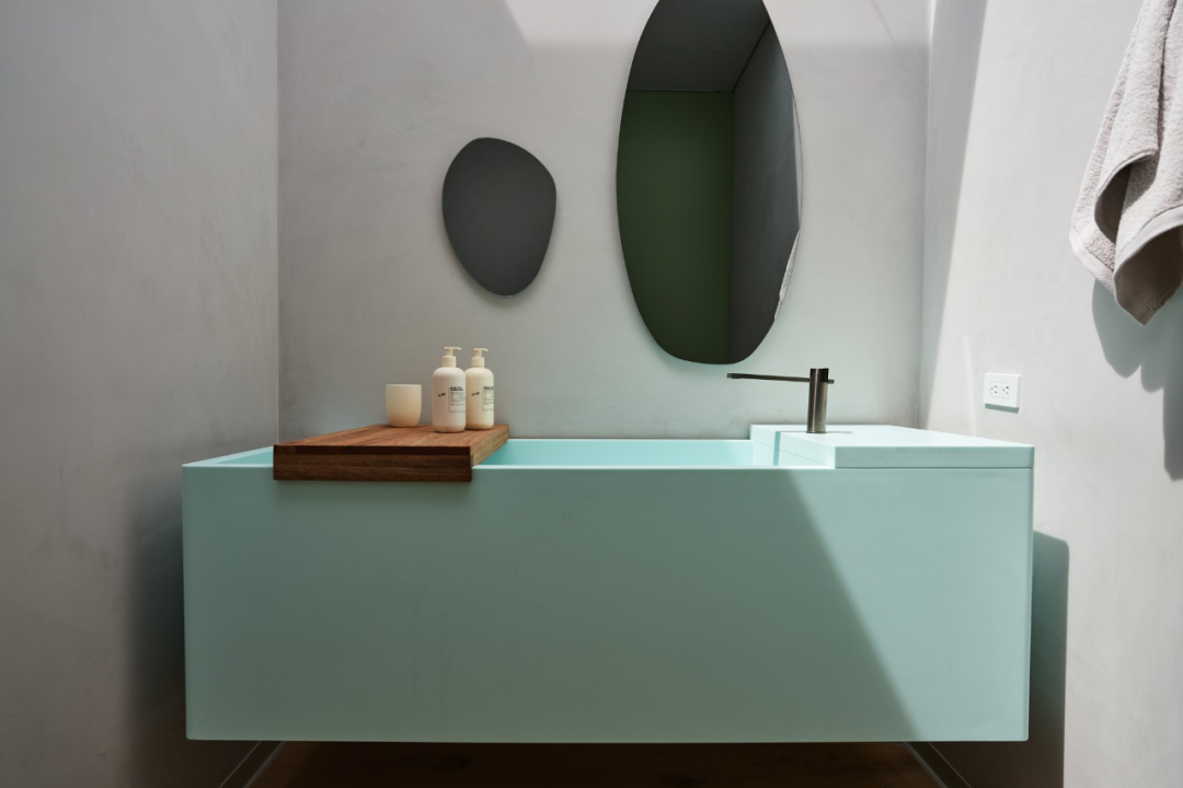 卫生间内定制的薄荷绿台盆、独立浴缸,带来一股清新舒适的高级感。