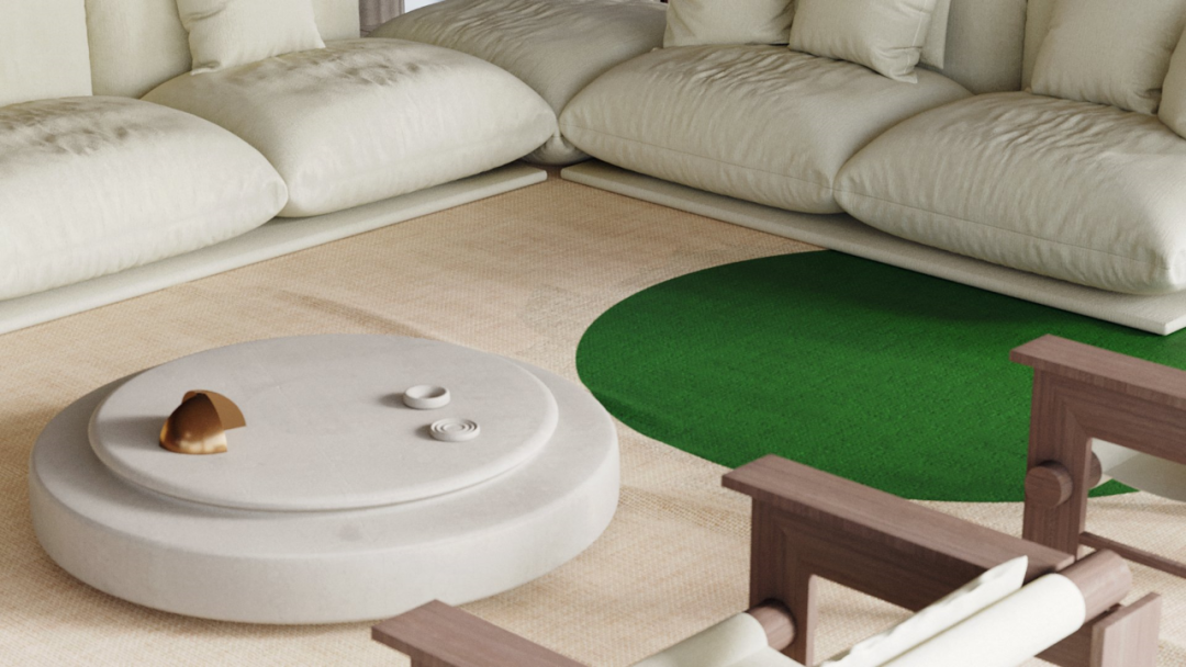 客厅根据空间需求选择了由 Pierre Paulin 于 1967 年为意大利制造商 La Cividina 设计的「Osaka」沙发与一对大理石茶几,结合浅色地毯位置摆放,强化流畅的线条韵律。