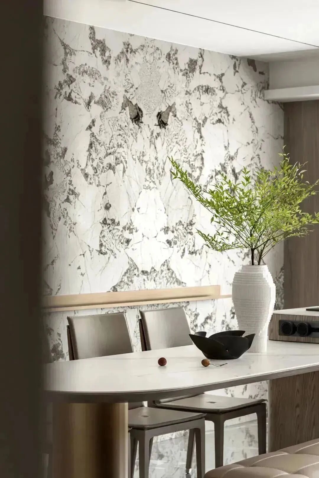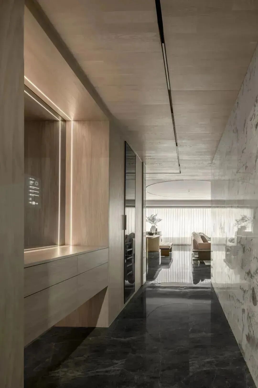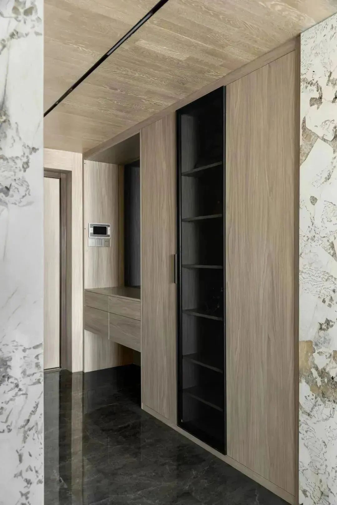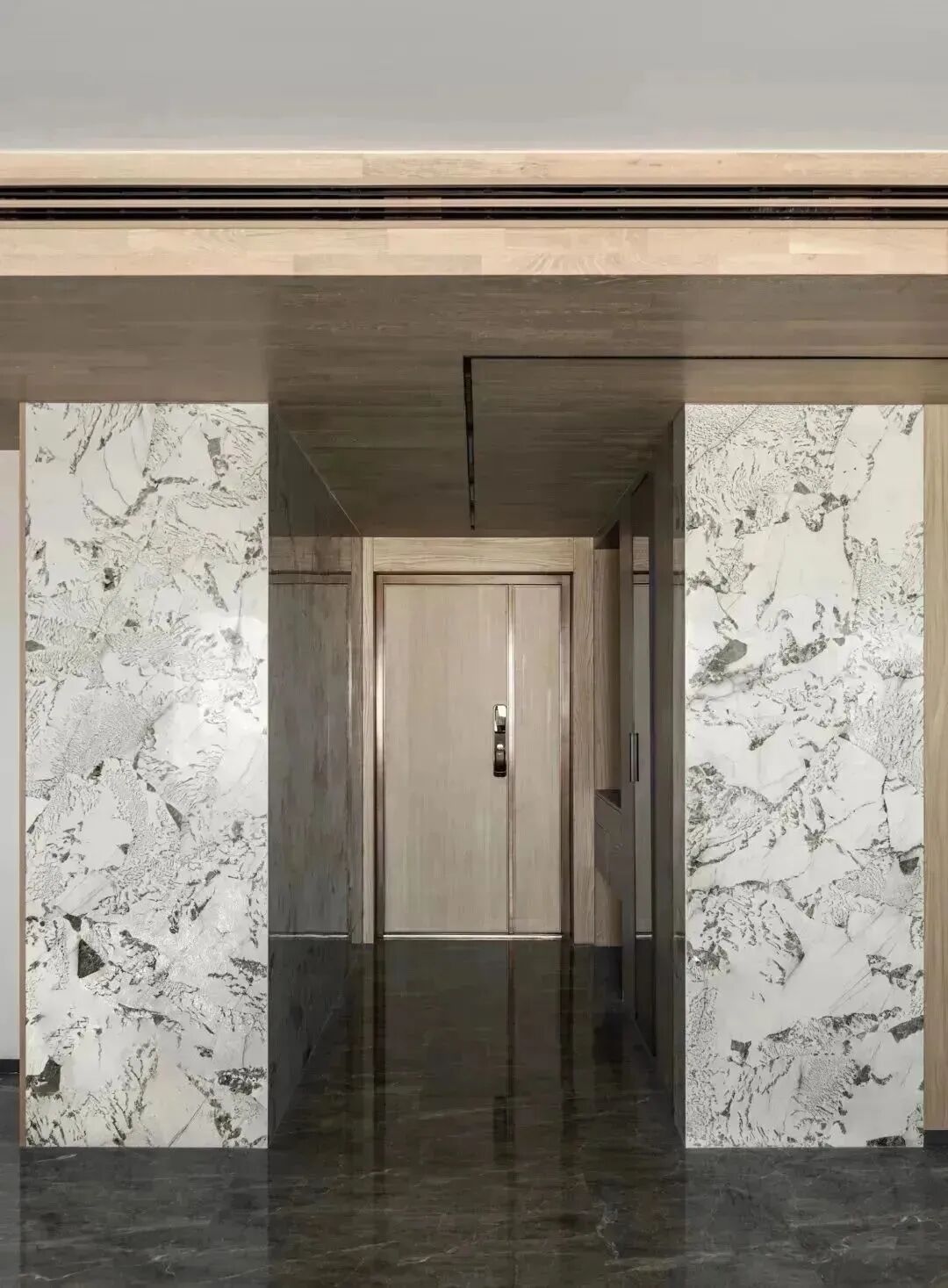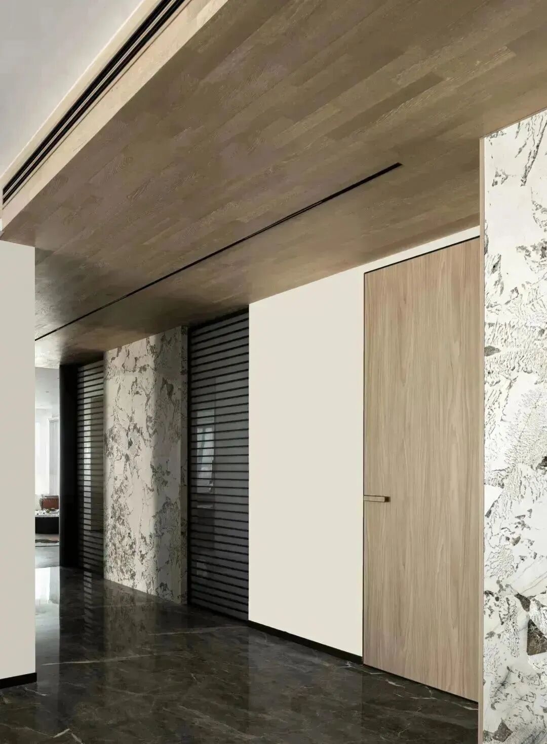 对空间建筑而言,材质间的碰撞,如文章里各色的辞藻,时而开门见山,时而娓娓道来。在这里,进门处木饰面和天然花纹石材墙面相呼应,诠释温润而有力的品格,清晰勾勒的轮廓,极致的精神从空间的序章开启。