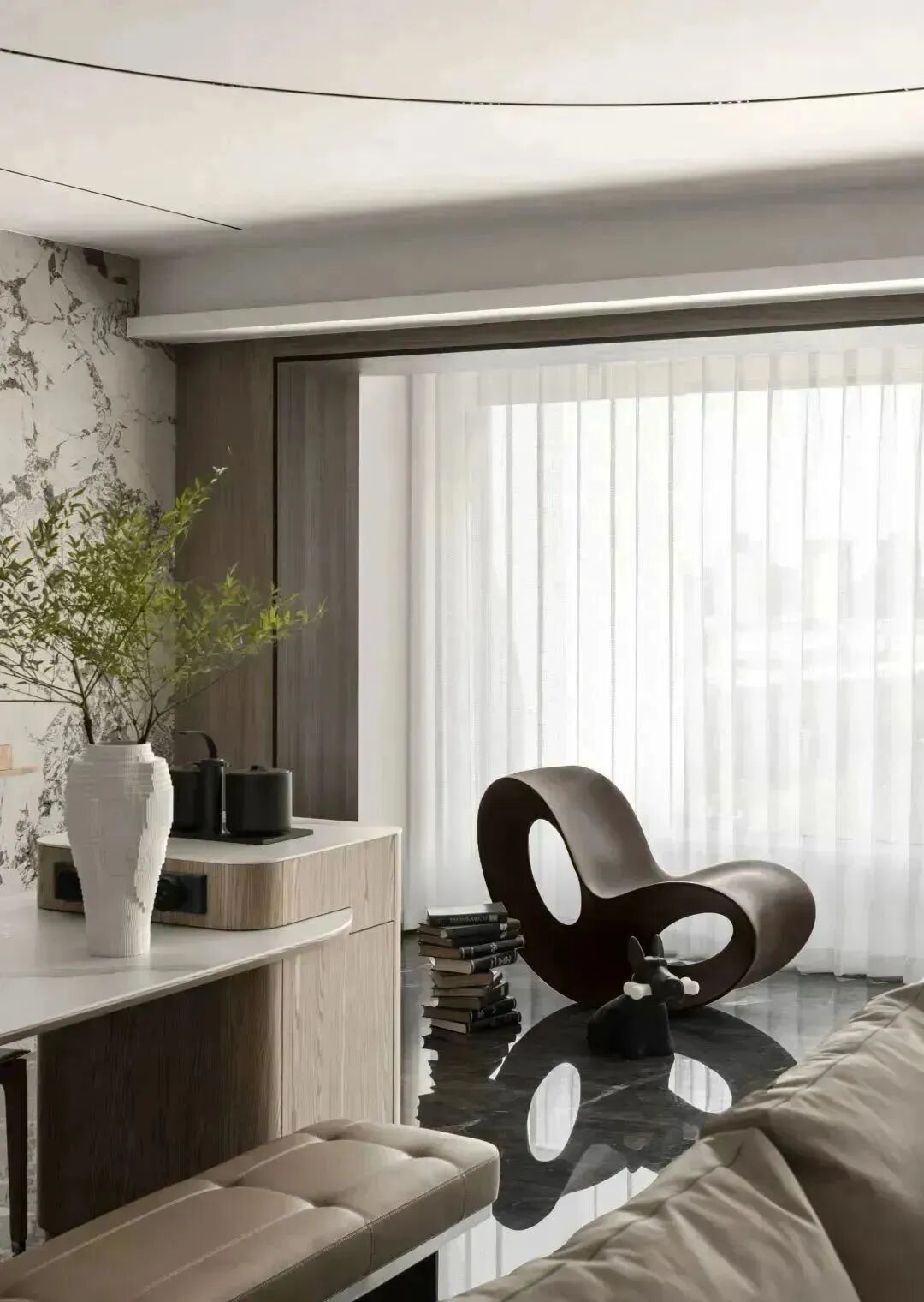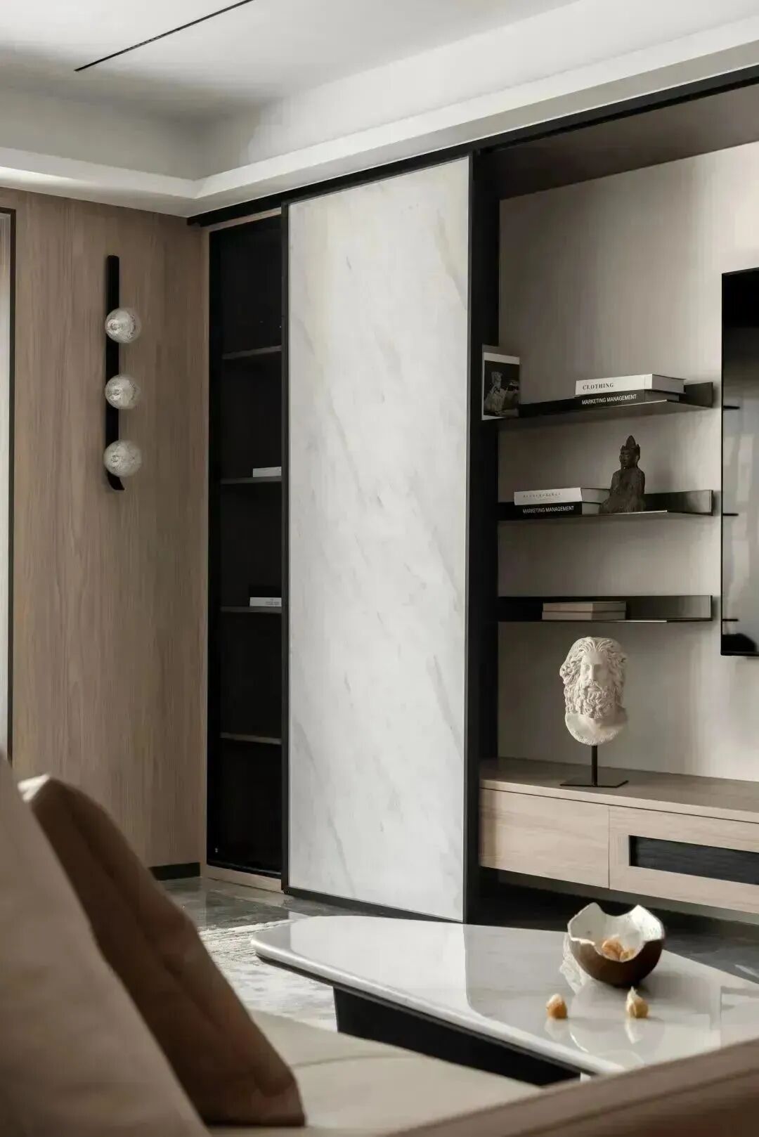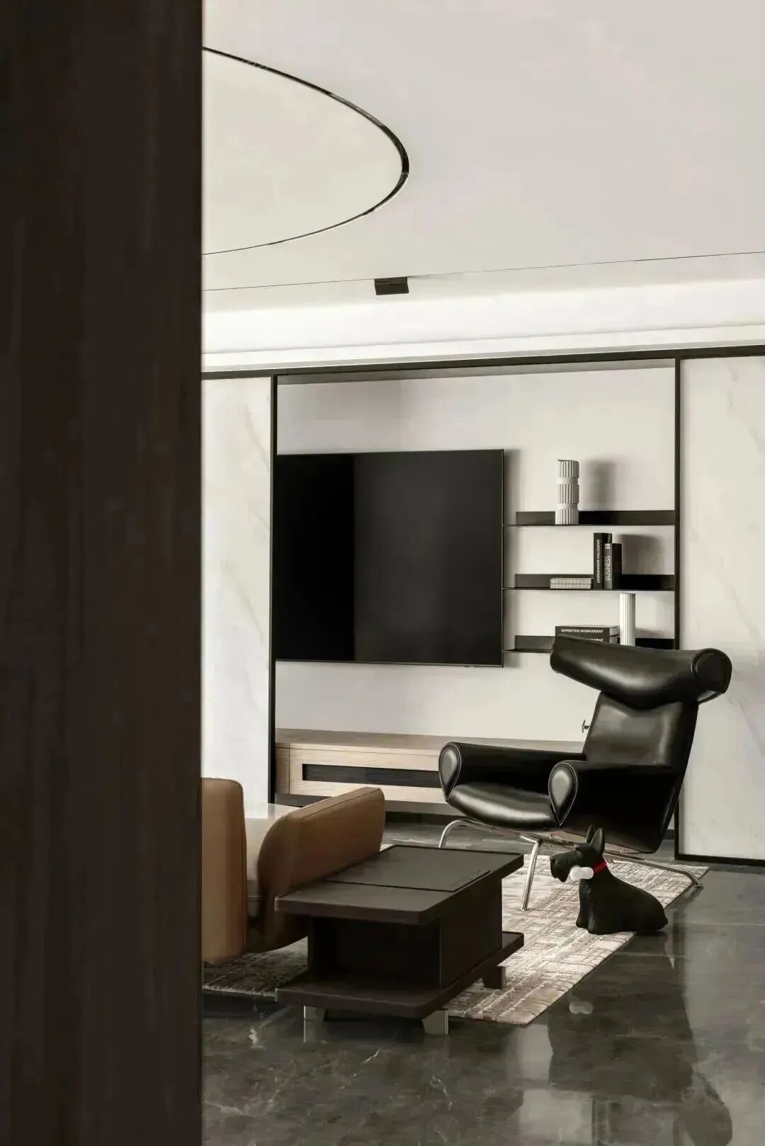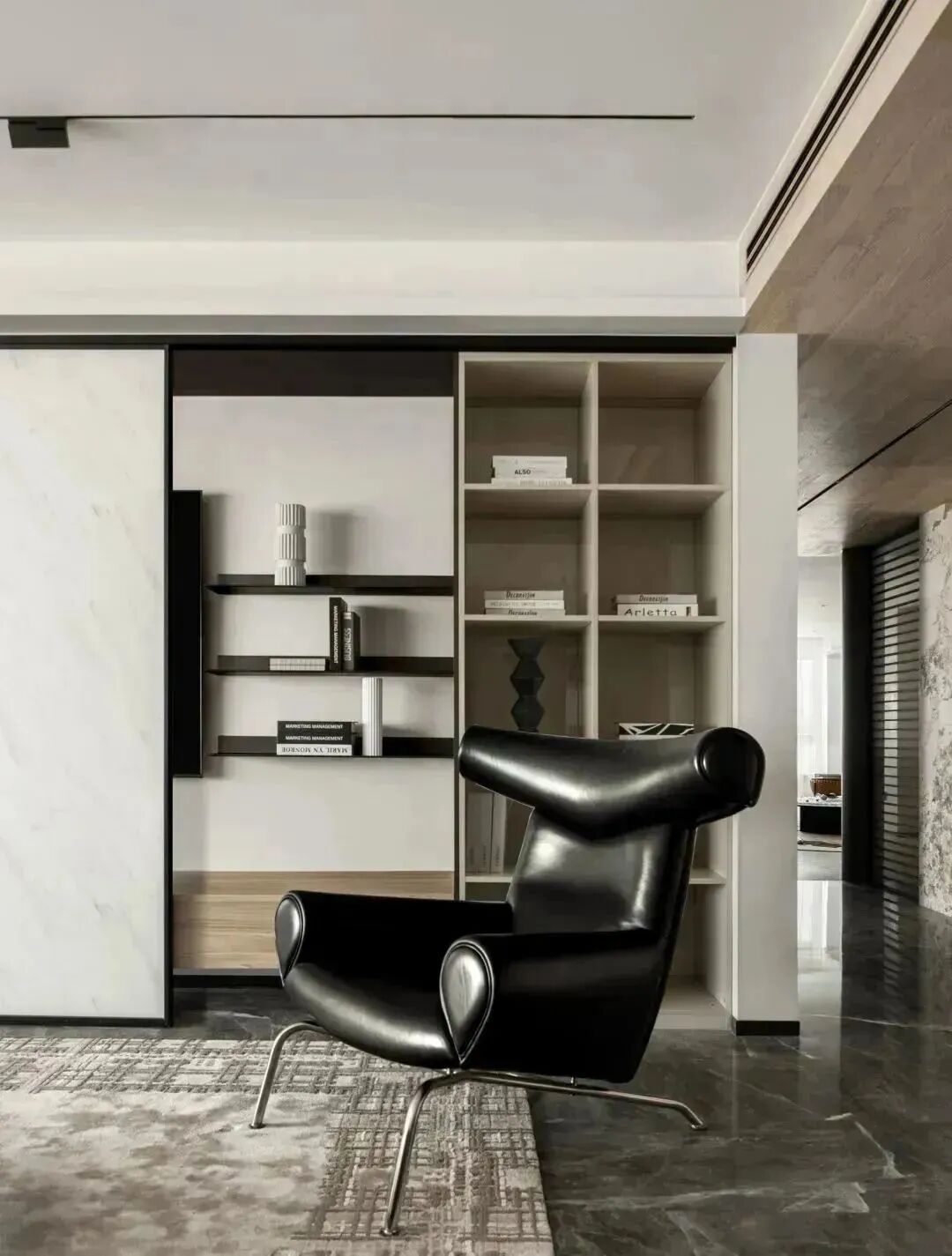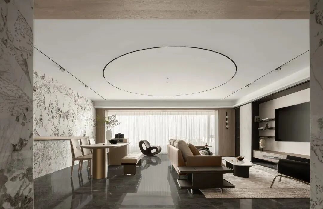 起居空间里,黑色成为构成空间的骨骼脉络,而地面的黑色石材纹路的展开,如同墙面纹路的延展,成为“天与地”的对立,相辅相成,展现出写意画般的神韵。