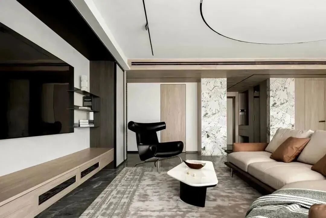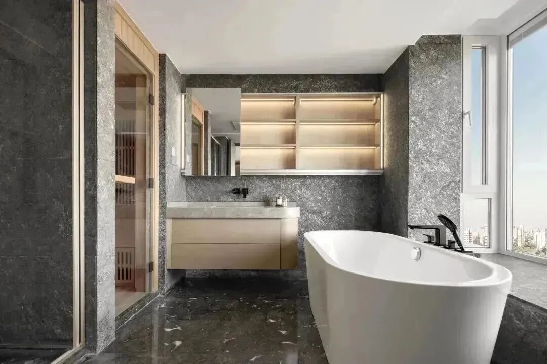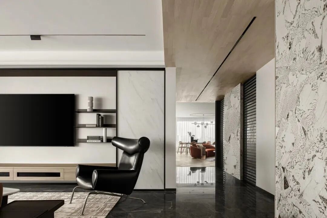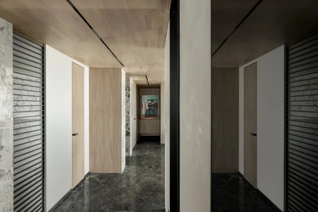 如前所述,材质间的碰撞,从进门处一直延续至空间里的每个房间,而这种质感的差异化,塑造出空间别样的艺术美,如音乐的音符,也如绘画的笔触,时而通过顿挫的石材塑造硬朗刚劲,时而运用水墨画般的石材渲染浪漫诗意,时而将温暖平和,用极具质感的木材描绘。