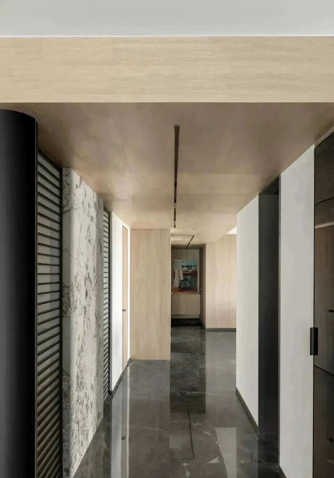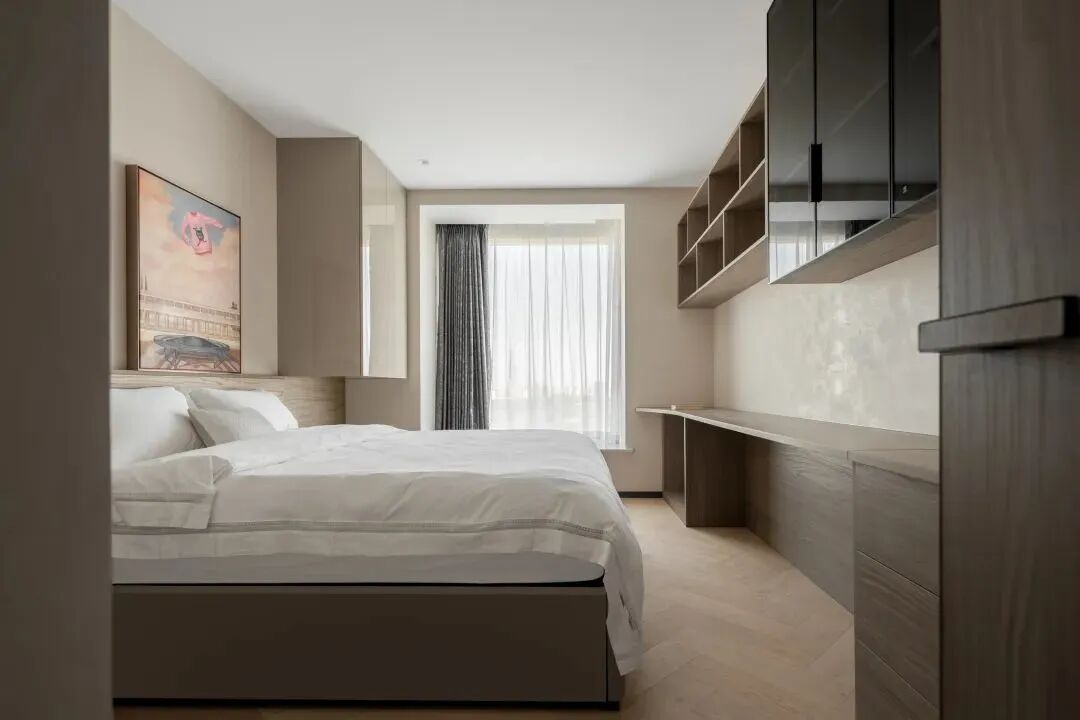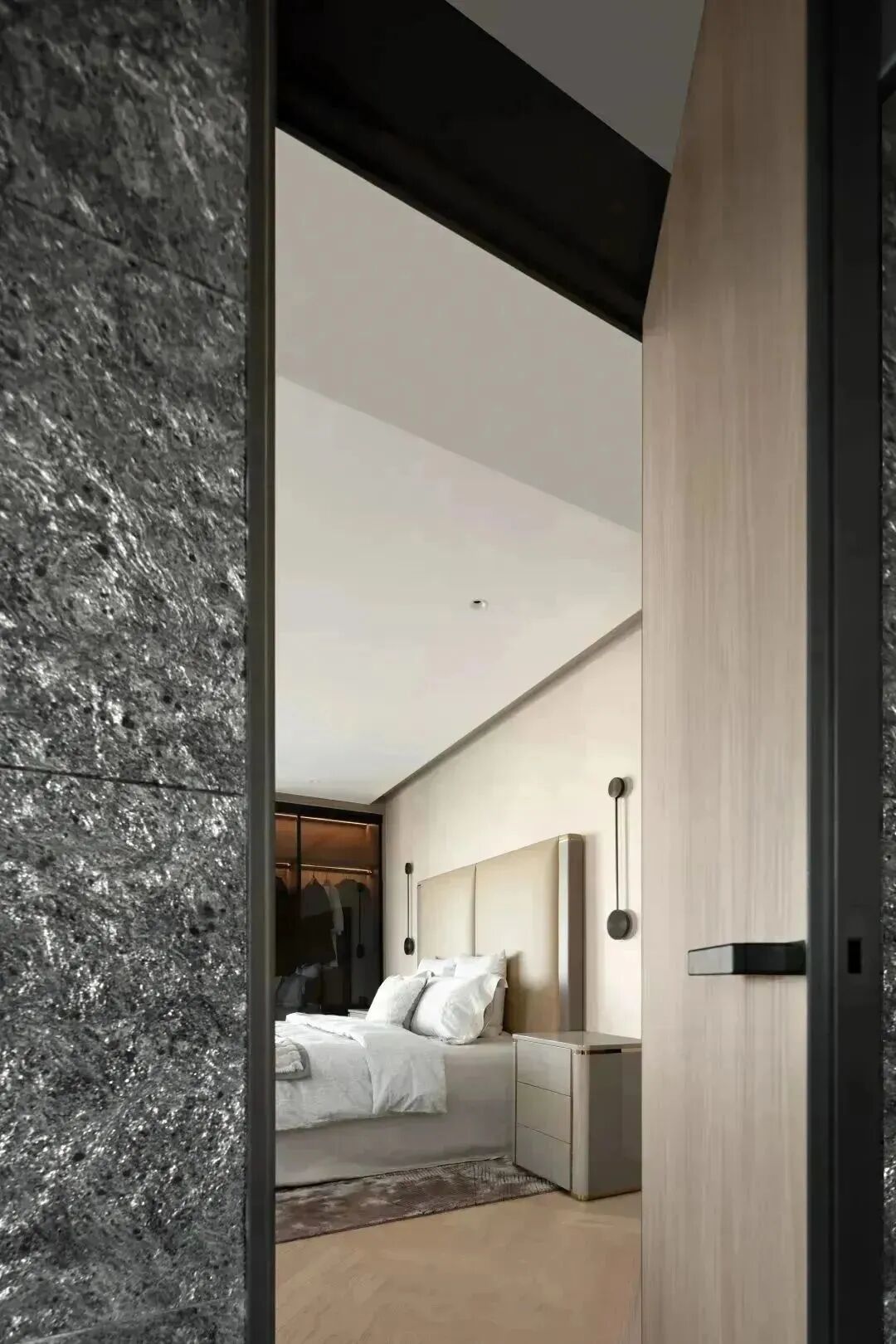 如前所述,材质间的碰撞,从进门处一直延续至空间里的每个房间,而这种质感的差异化,塑造出空间别样的艺术美,如音乐的音符,也如绘画的笔触,时而通过顿挫的石材塑造硬朗刚劲,时而运用水墨画般的石材渲染浪漫诗意,时而将温暖平和,用极具质感的木材描绘。