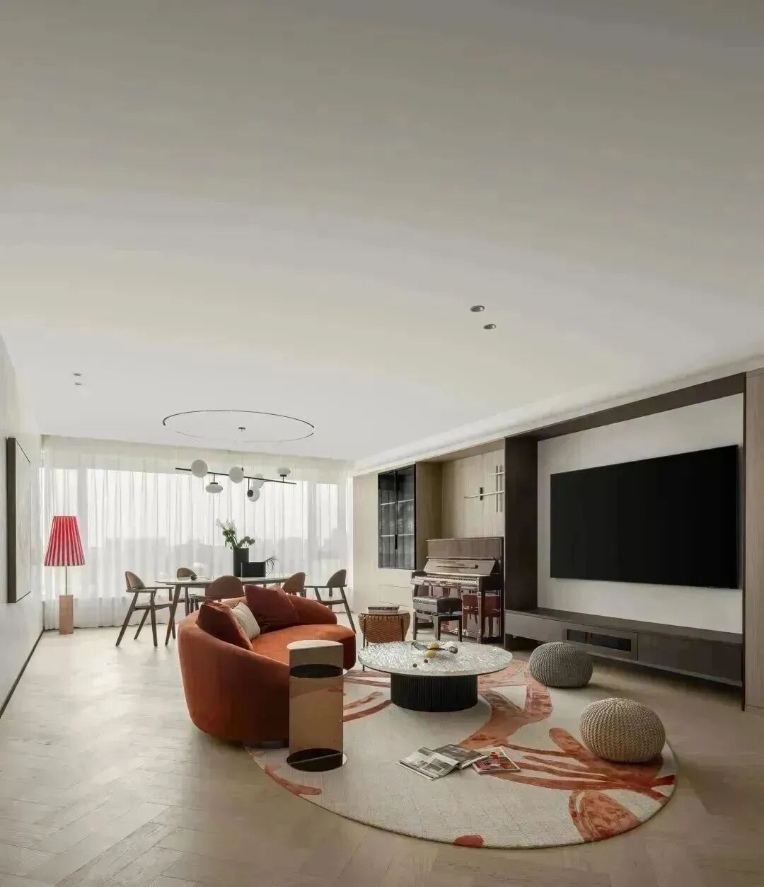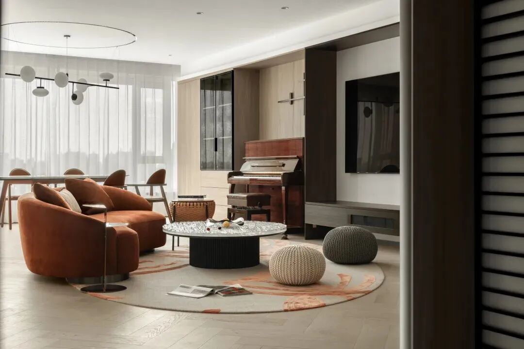 橙色调的空间,凸显家庭生活的温暖融洽,伴着琴键的跳动,或慵懒坐卧在沙发,或在窗边就餐,家人相聚于此,尽享生活乐事。