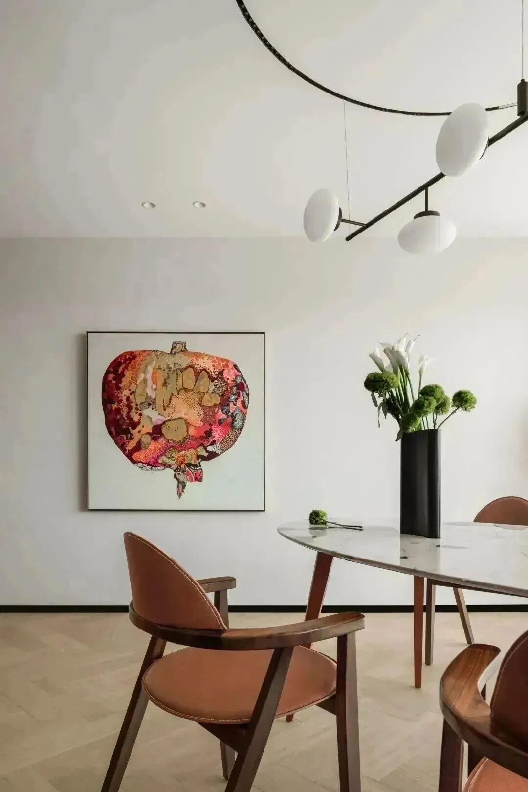 由栗原由子所绘制的艺术挂画《ruby》置于餐桌的尽头,融合想象力的视觉表达,加之童画般绚烂的配色,华丽又甜美,与空间整体氛围相得益彰。