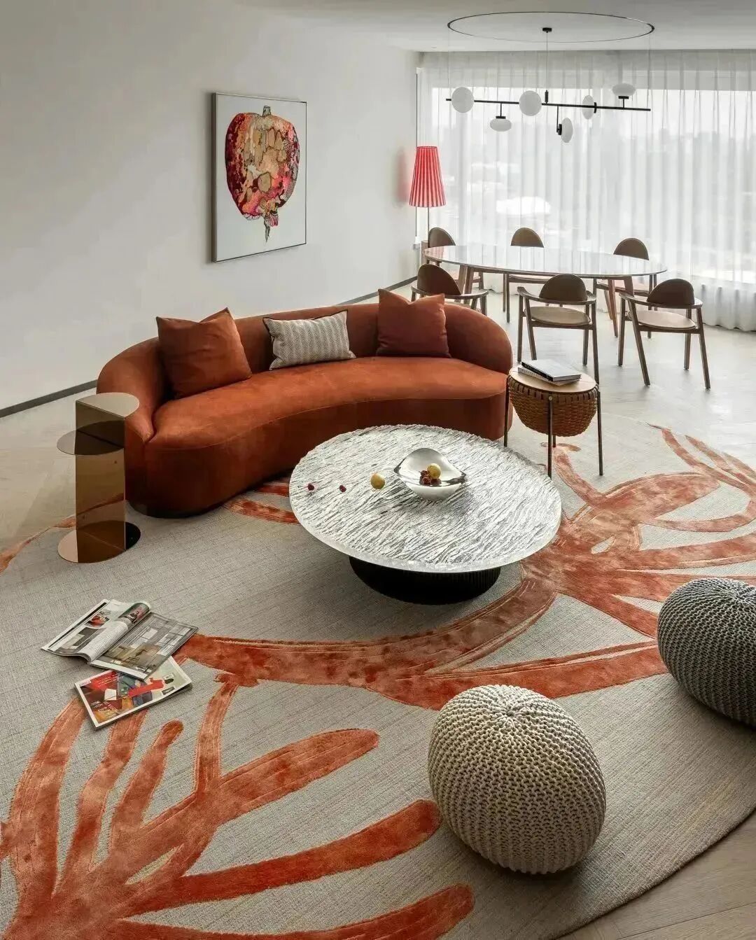 就像在《揽星居》这一作品中,我用到了很多柱子这样结构设计,它更多地是体现出男主人的力量感,征服欲。而在私人家庭室中,以生命之花为图案的《燃》这一地毯,在空间里占据着突出位置,你可以看到橙色所代表的热烈、激情和温暖,一种向上积极的文化表达。在家居空间中,这种情感冲击是潜移默化的。