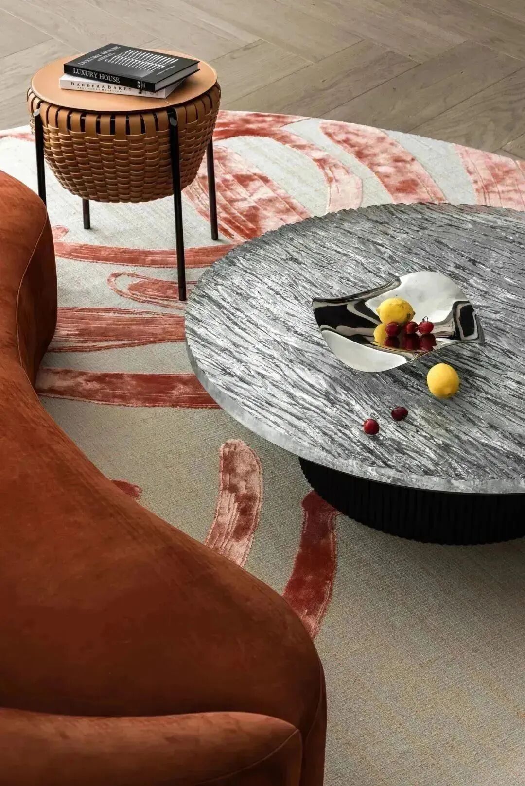 GamFratesi为Poltrona Frau设计的Cestlavie茶几,藤编的储物基座,为空间增添了自然清新调性,与一旁获得汉诺威最佳设计奖的地毯《燃》所描绘的富有生机的“生命之花”一道,将家庭私人空间中的轻松、向上与舒适和盘托出,而“生命之花”所代表的积极的能量感,更是在当下这样一个特殊时期里,充满振奋人心力量的意象所在。