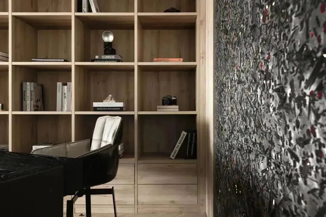 在书房中,设计师选择用一面红黑两色晶体的石材墙面“夜玫瑰”做以装饰,夜幕阑珊时,与室外的灯火产生对照,墙面灿若星辰。