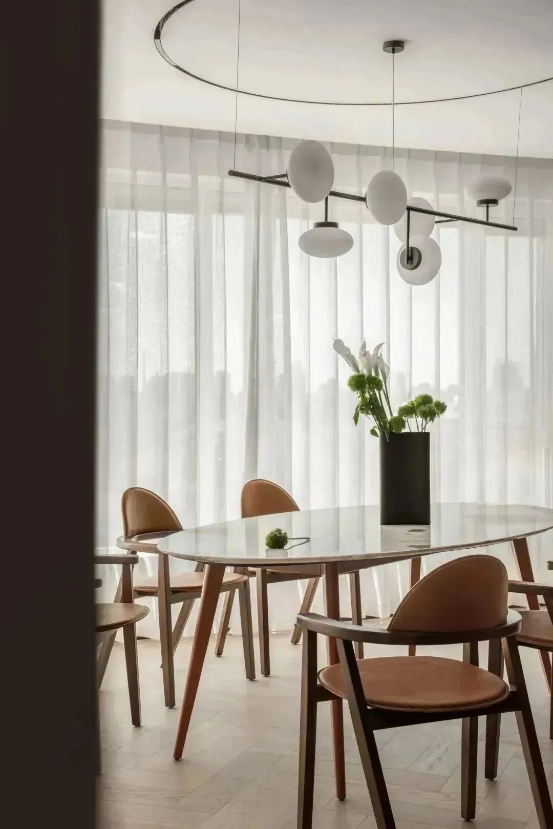 餐桌处选择在整个空间最为绝佳的位置,由窗望去,视野极为开阔,如展开的画卷,皆是京城的繁华美景。极致风光之外,是生活的惬意写照。似悬浮在空中的吊灯、餐桌台面与室外的风景,平行呈现,颇有时空的错落之感。