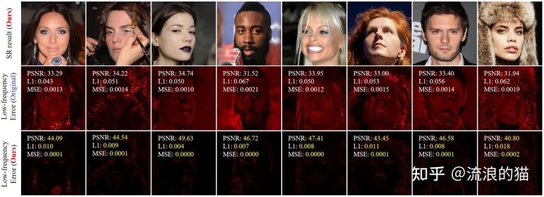 8xSR,第一行是我们的SR结果,第二行是原网络的下采样一致性误差(约束1),第三行是用我们方法训练的下采样一致性误差(约束1)。可见,我们的方法显著提高了一致性。