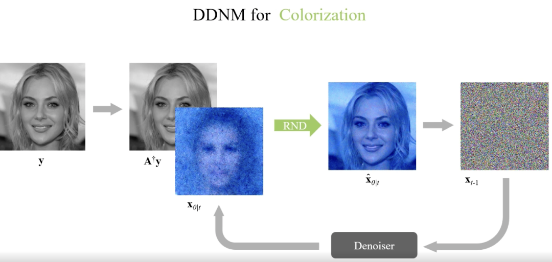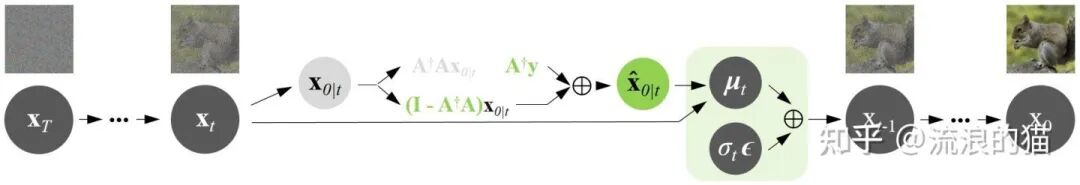 我们之前讨论的,都是 y=Ax 的无噪线性逆问题。如何解决含噪的线性逆问题 y=Ax+n 呢?通过分析发现,该噪声 n 最终会成为含噪图 xt−1 的一部分。因此我们的思路很简单,就是利用扩散模型本身的去噪器来去除值域中的噪声 n 。