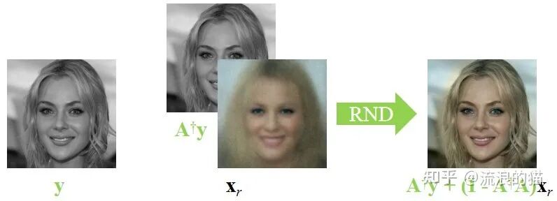 对于该通解来说,不论 xr 如何取值,约束1都是完全满足的。那么在我们的设定中,图像逆问题就只剩下了约束2,也就是要求 xr 使得 x^ 符合目标图像域的分布。本质上,我们要求解的就是零域部分。