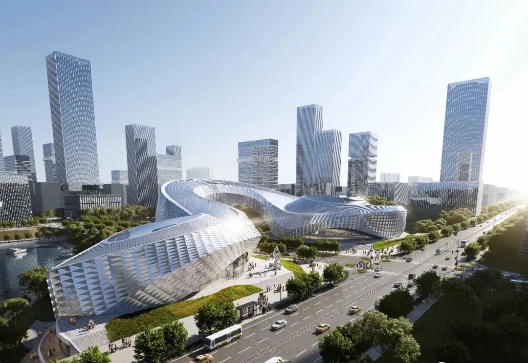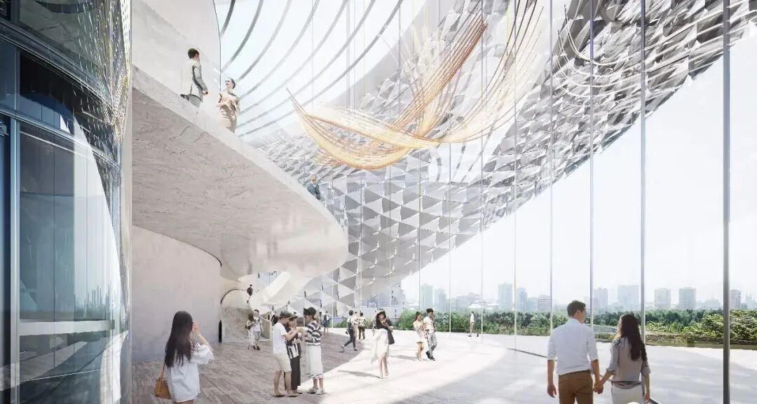 建筑造型以“光之冕”为主题。形体似江河舞动之姿,寓意“江汉朝宗于海” ;建筑表皮采用智能光伏幕墙,呈光与水波交融的意向,打造出一尊绚丽多姿,流光溢彩的光冕,象征着为东湖新区成为世界光谷的伟大目标加冕。