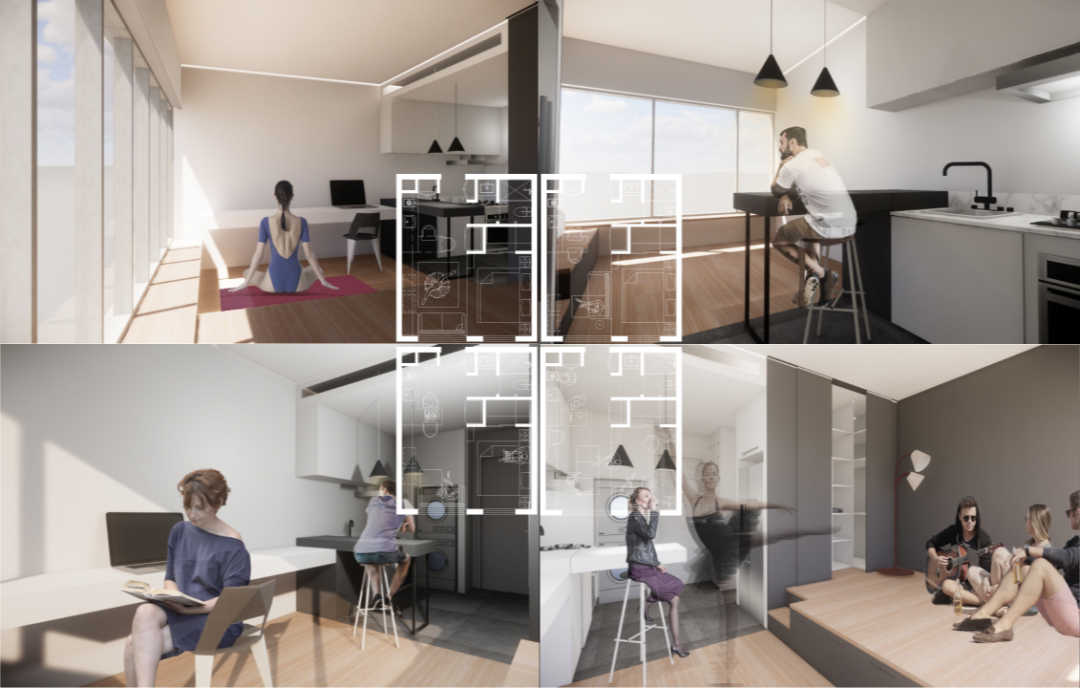 因此我们对于住宅公寓空间的基本概念是要建造和设计一个非常灵活的空间,可以通过对空间的延展适应住户多样的生活方式,这就是为什么我们设计的公寓基本上都是一个四合一的正方形方块。常规的公寓比例都是长方形,而我们是正方形,于是就可以分成四个象限,黑色的地方固定作为卫生间使用,除此之外其他的地方都可以灵活使用,比如说我们可以把厨房和起居室合并成一个较大的餐厅或者工作区,而卧室变成一个独立空间,再比如可以把卧室和起居室结合在一起,成为一个更大的起居空间。这种接近正方块的居住单元更易于适应年轻人千变万化的生活场景。