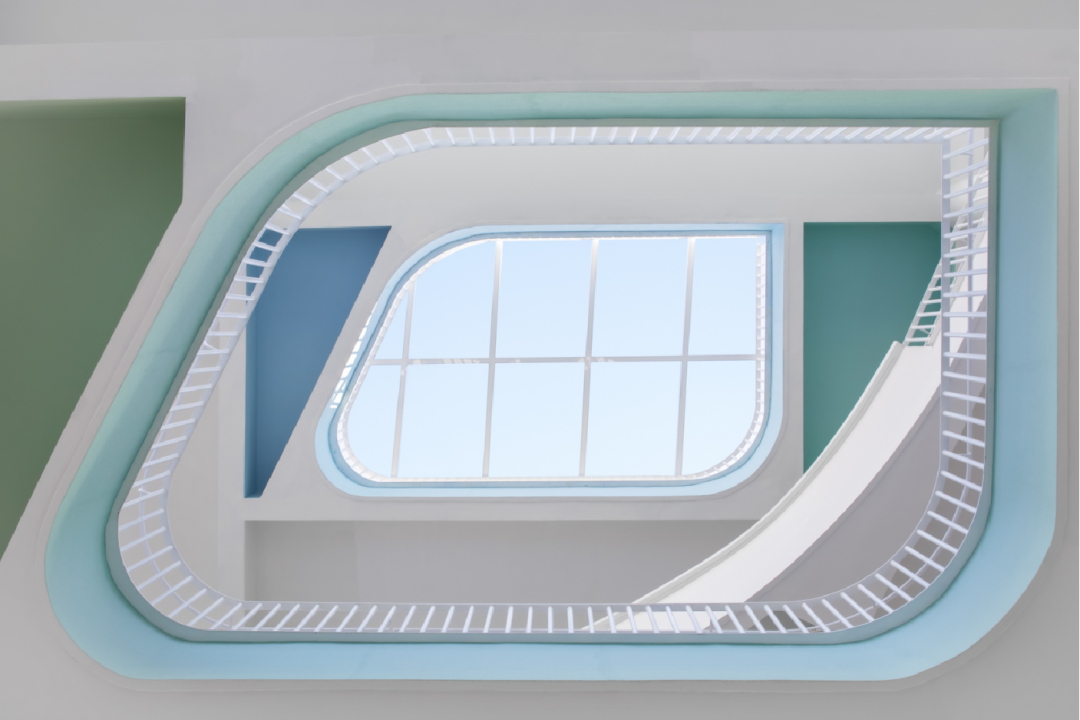 这里是另外一个隐喻,从下往上看像一个倒置的调色板,从而来吸引孩子们的注意,这里用了很多蓝色和绿色的元素,中间是贯通且错位的天井,鼓励孩子们和不同楼层以及年级的小朋友进行视线上的互动。