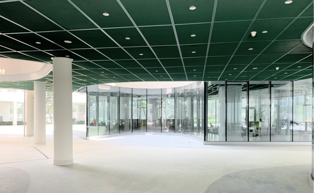 可以注意到弧形的建筑轮廓和其他周边的楼宇形成的强烈反差,最外侧有两个金属壳体,都是三维曲面。