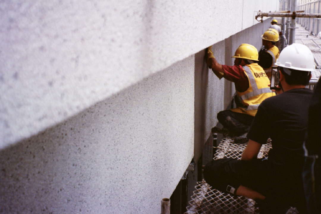 最后我想给大家讲下该项目的外立面涂层材料,裙房主要采用水刷石,有些国家称为魔法石,我们这边过去的工艺叫做水洗石,一个世纪前上海很多老建筑都用这种外墙材料,相比商业项目中更常使用的幕墙系统价格更低廉,也能够延续更多的城市记忆。