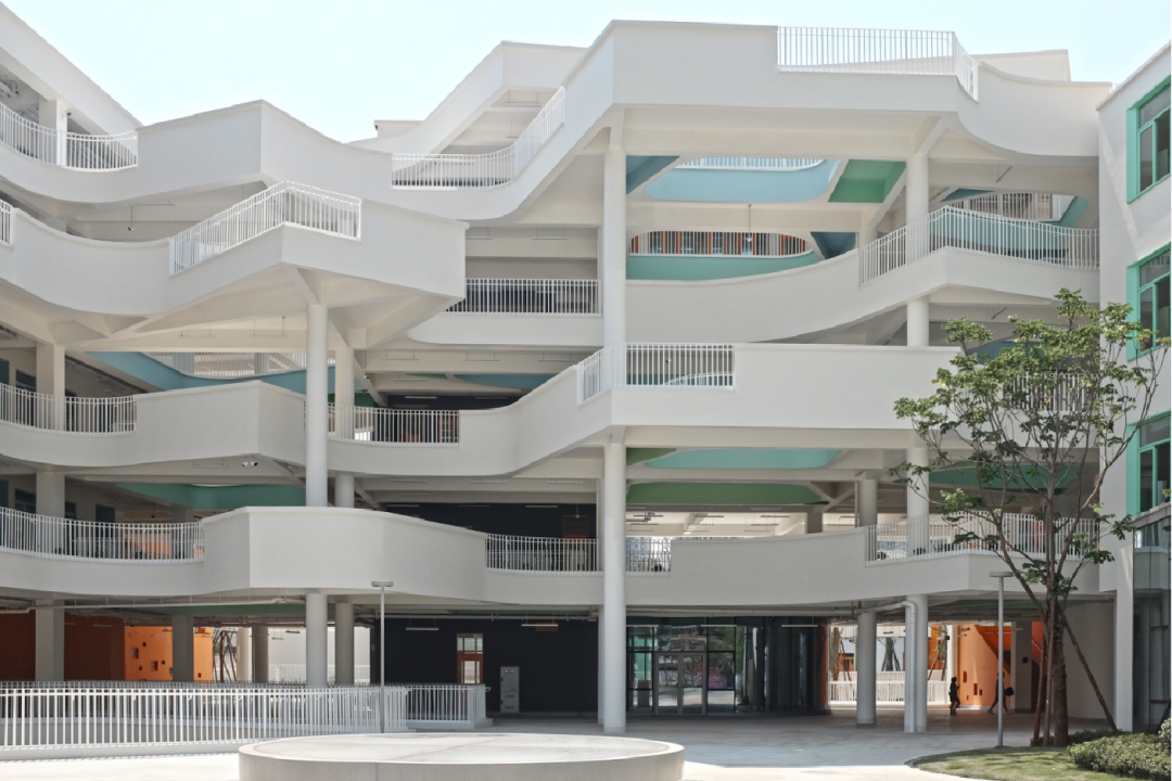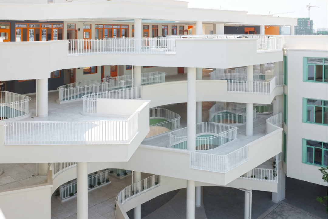 如果一个小朋友的教室在较高的楼层,他可能要花几分钟才能到下面的操场,因此我希望能够把活动场地直接建在开放空间,让他们在第一时间拥抱阳光和自由,在这些走廊和平台上尽情玩耍嬉闹,我把它比喻为一个垂直的操场。