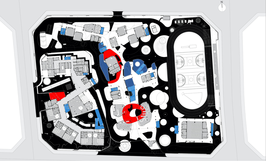 接下来是运动中心,这里有一条地铁线途经了我们北边的一个地块,所以在北边是不允许建造建筑,于是我们就会考虑能不能够做一些足球场、网球场这样的公共设施,而在运动中心内部,则包括了游泳池、健身房、电竞中心、室内篮球场,和半户外运动场等功能。