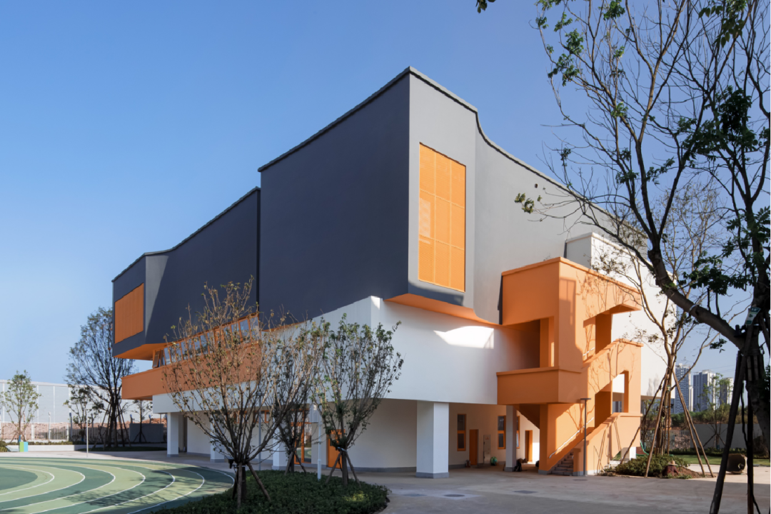 这是教学楼的外立面开窗,也是所有教室单元的立面母题,灵感来自于孩子们喜欢在家里来回闭合的开关,也契合了他们随时切换的动机。