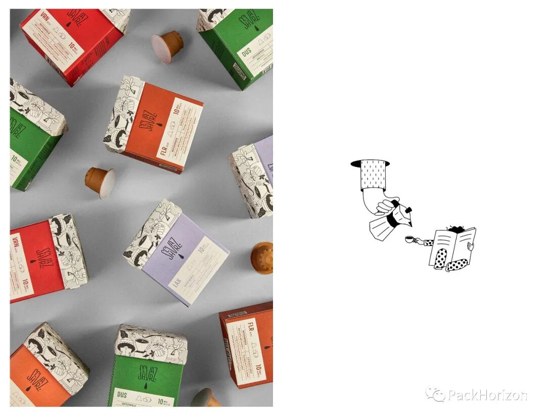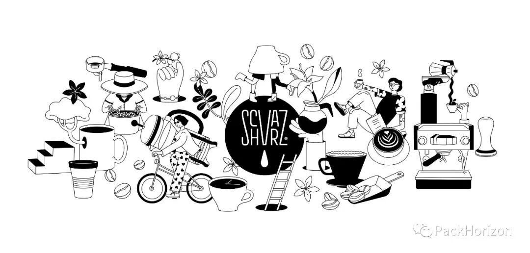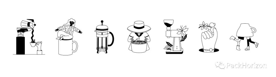 在简洁和信息丰富的设计之间创造了平衡,但也为有趣的插图和图案提供了空间,以说明品牌对咖啡的热爱和知识。插图混合了有趣的角色,但也包含了非常具体的咖啡机和物品。